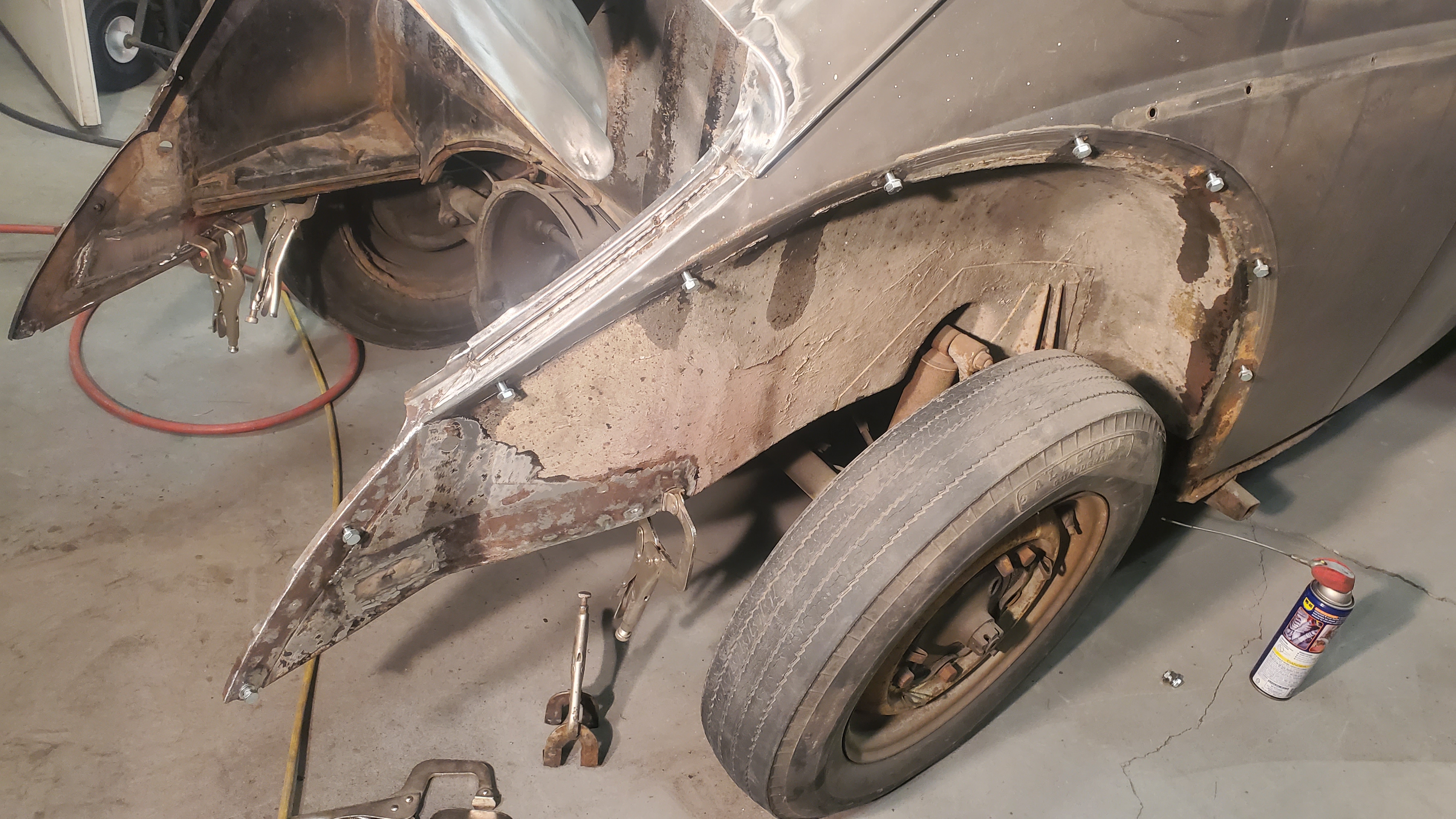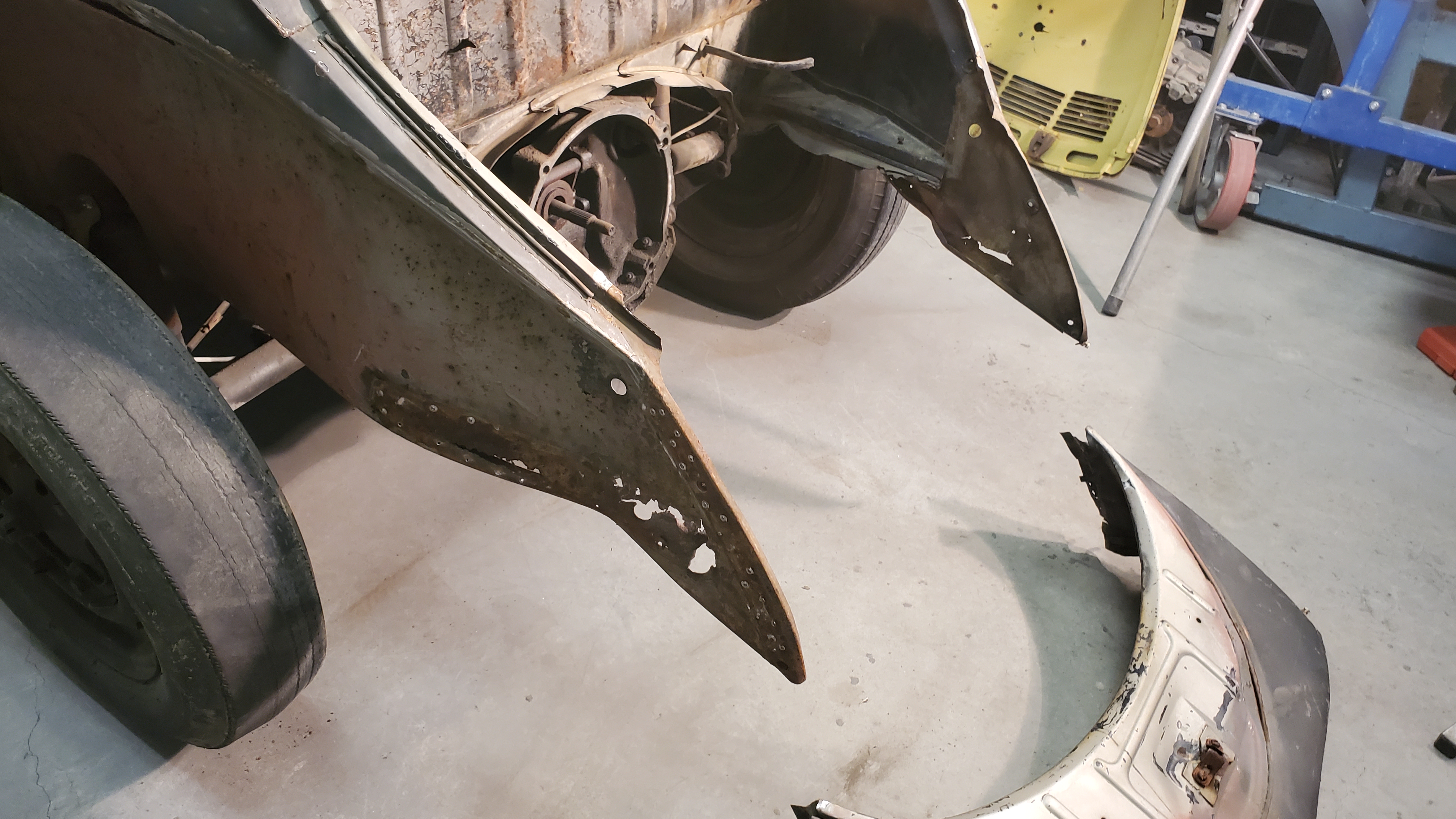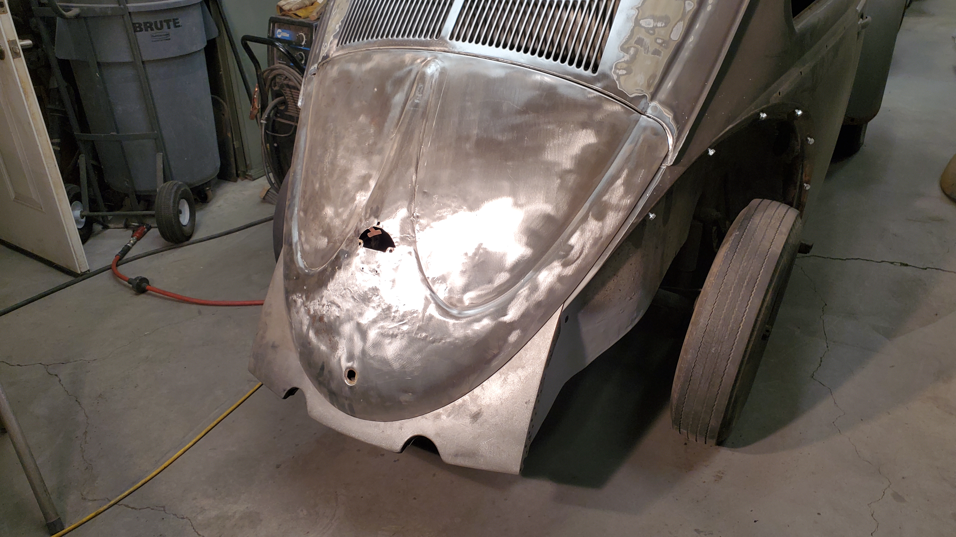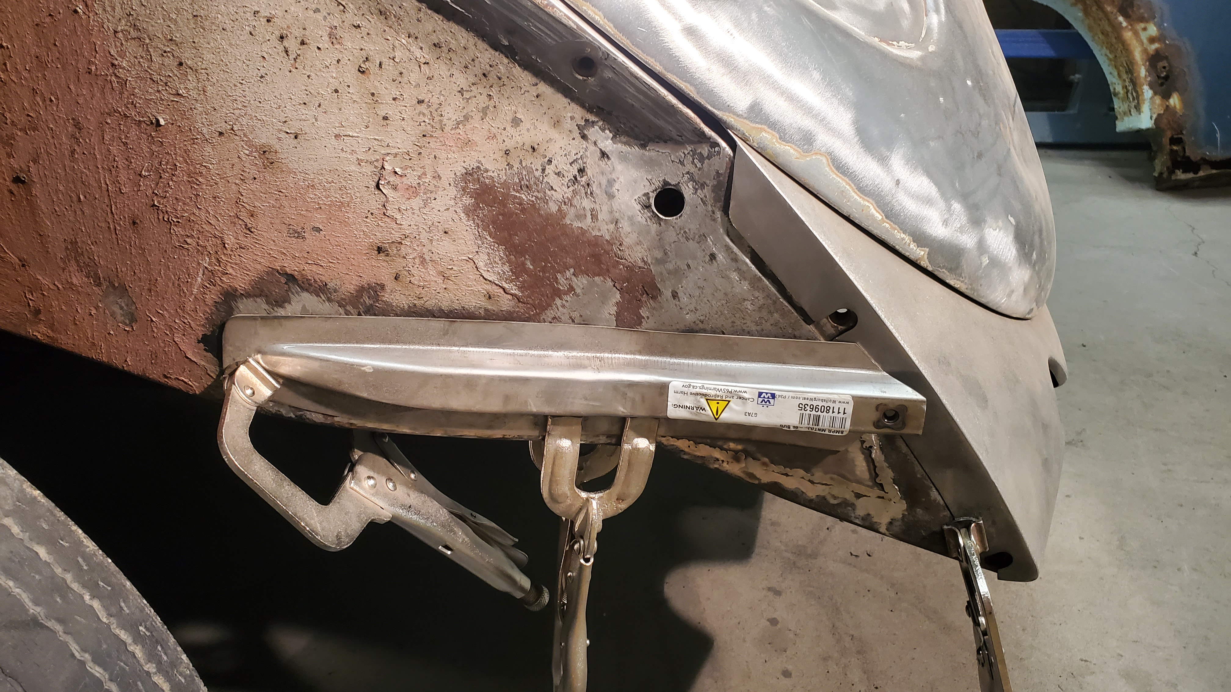 The fenders are NOS Italian that fit great and only needed minor work to come back into shape. The bottom of the passenger is really close, and the drivers side is down a bit. Both will be shaped to match the apron once everything is lined up with the rear bumper in place.