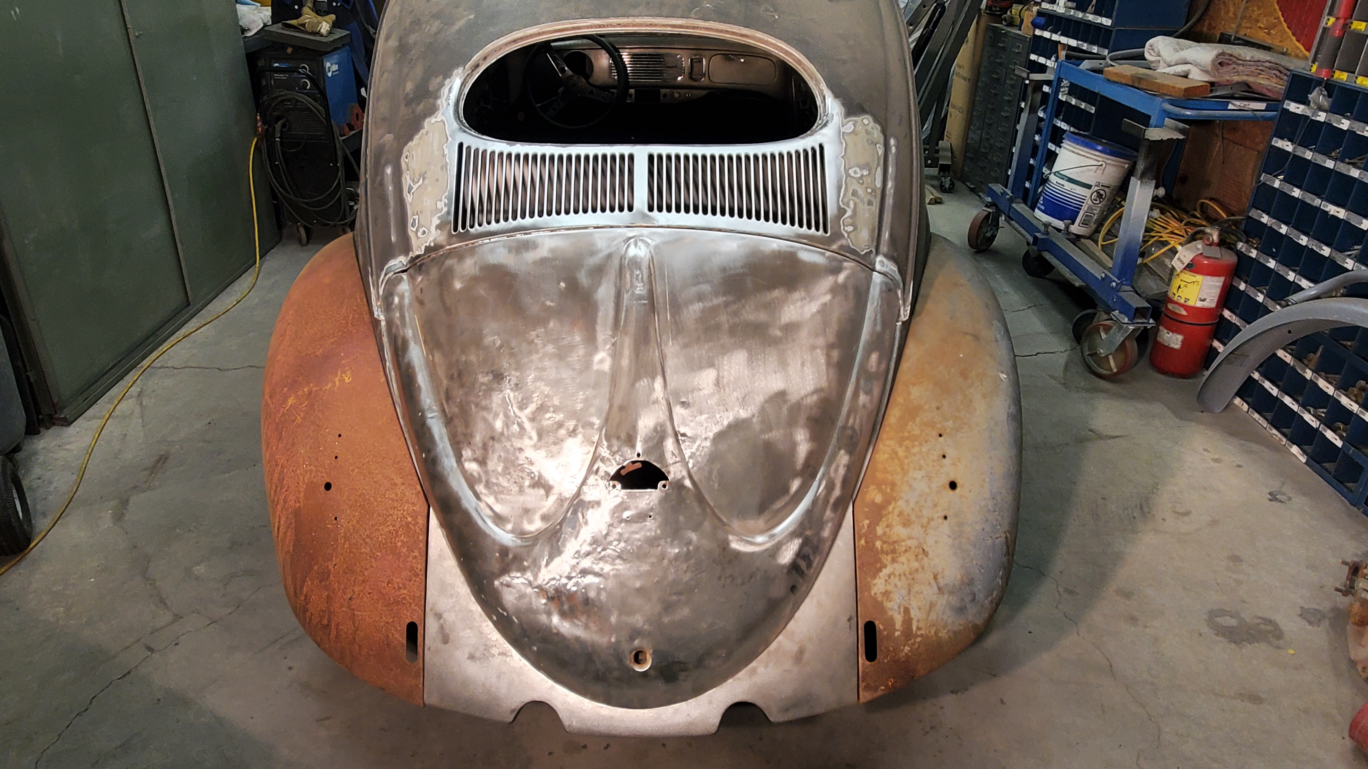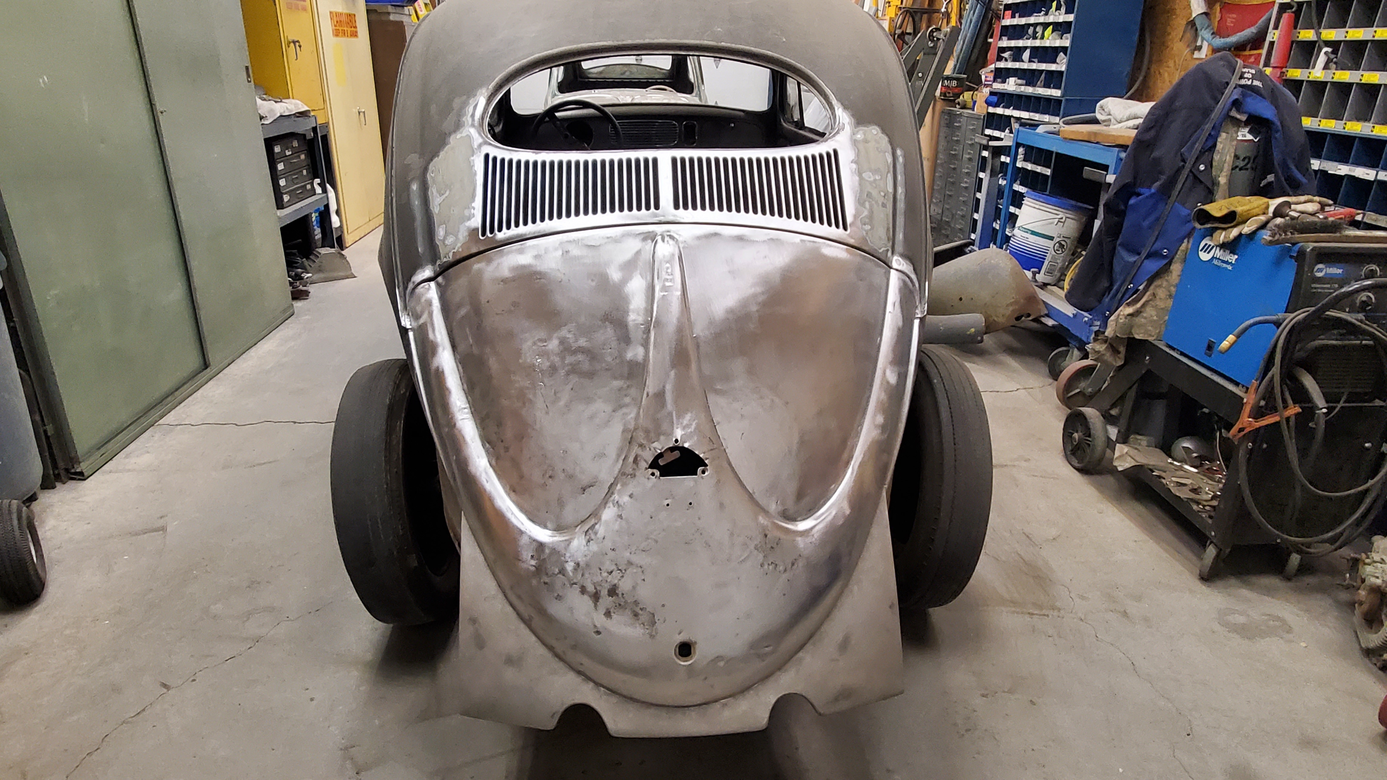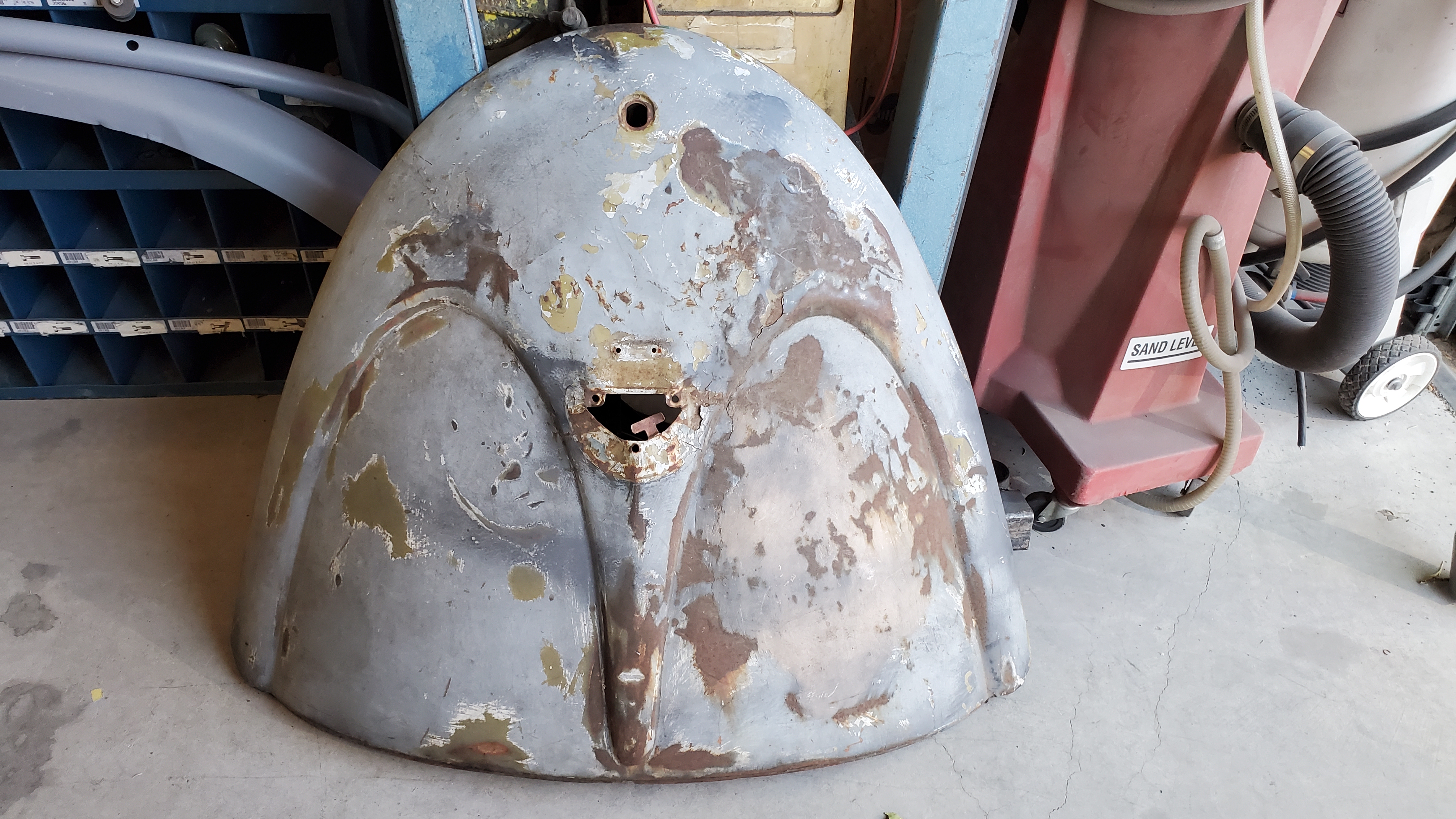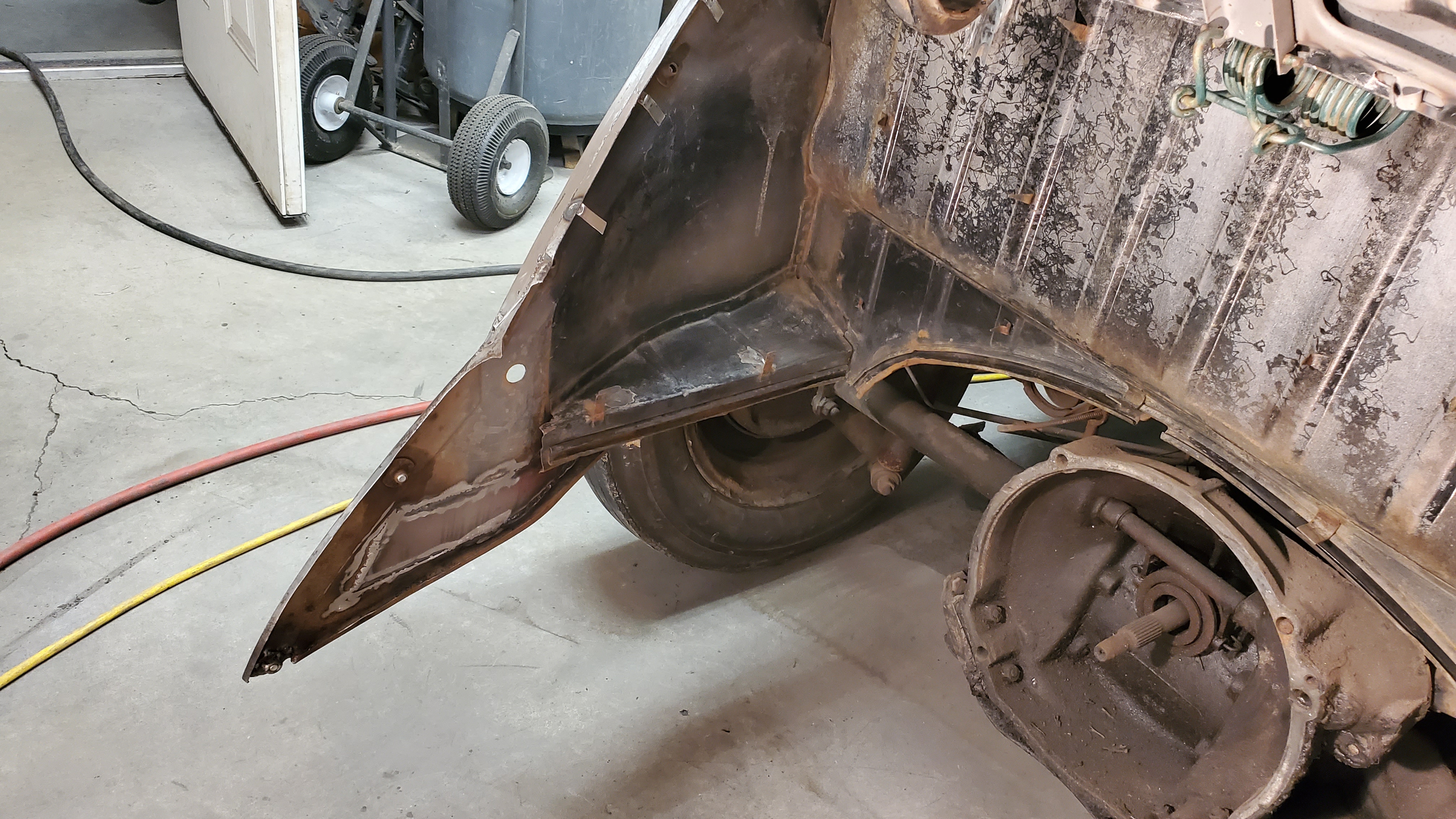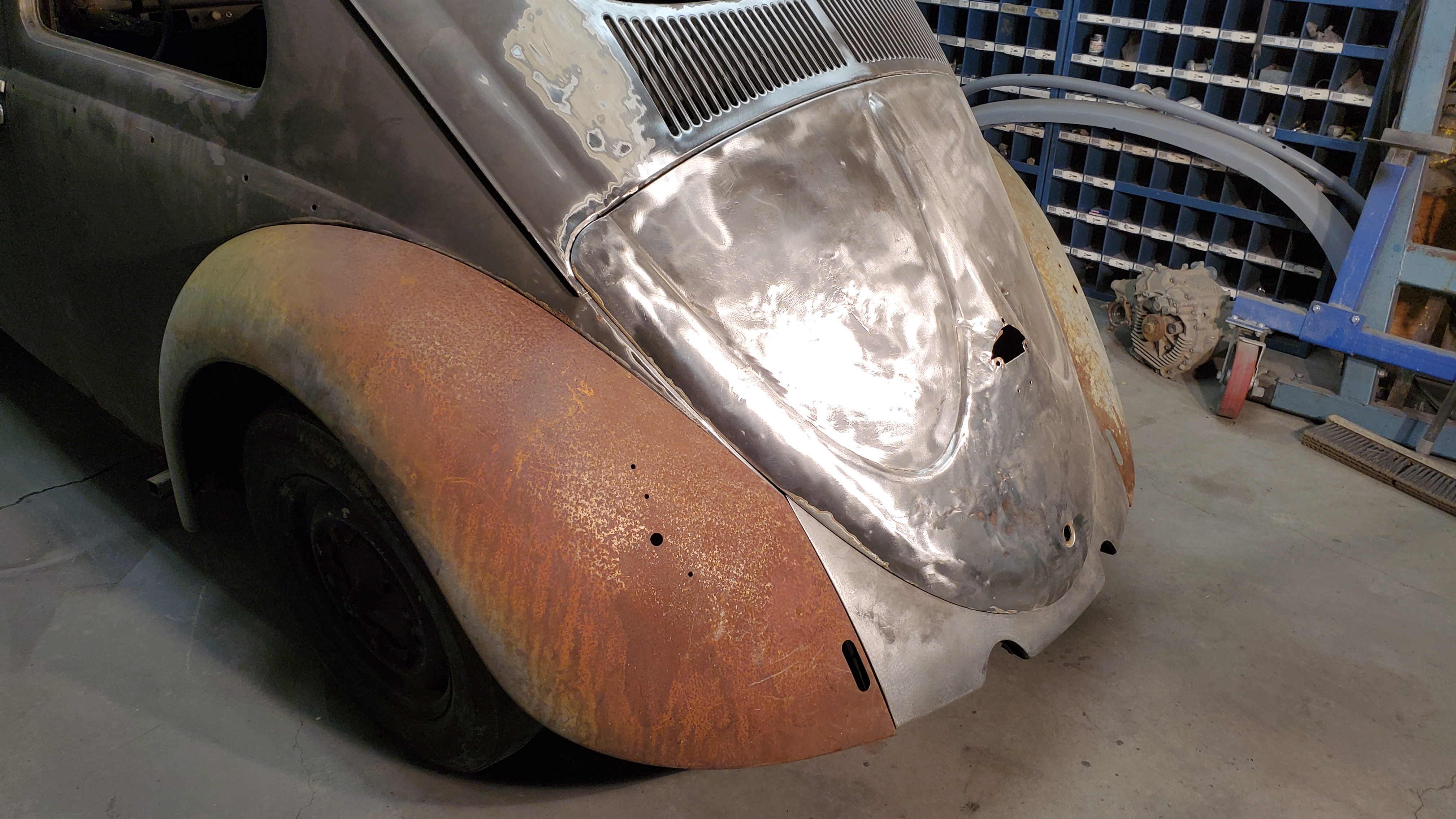The fenders are NOS Italian that fit great and only needed minor work to come back into shape. The bottom of the passenger is really close, and the drivers side is down a bit. Both will be shaped to match the apron once everything is lined up with the rear bumper in place.