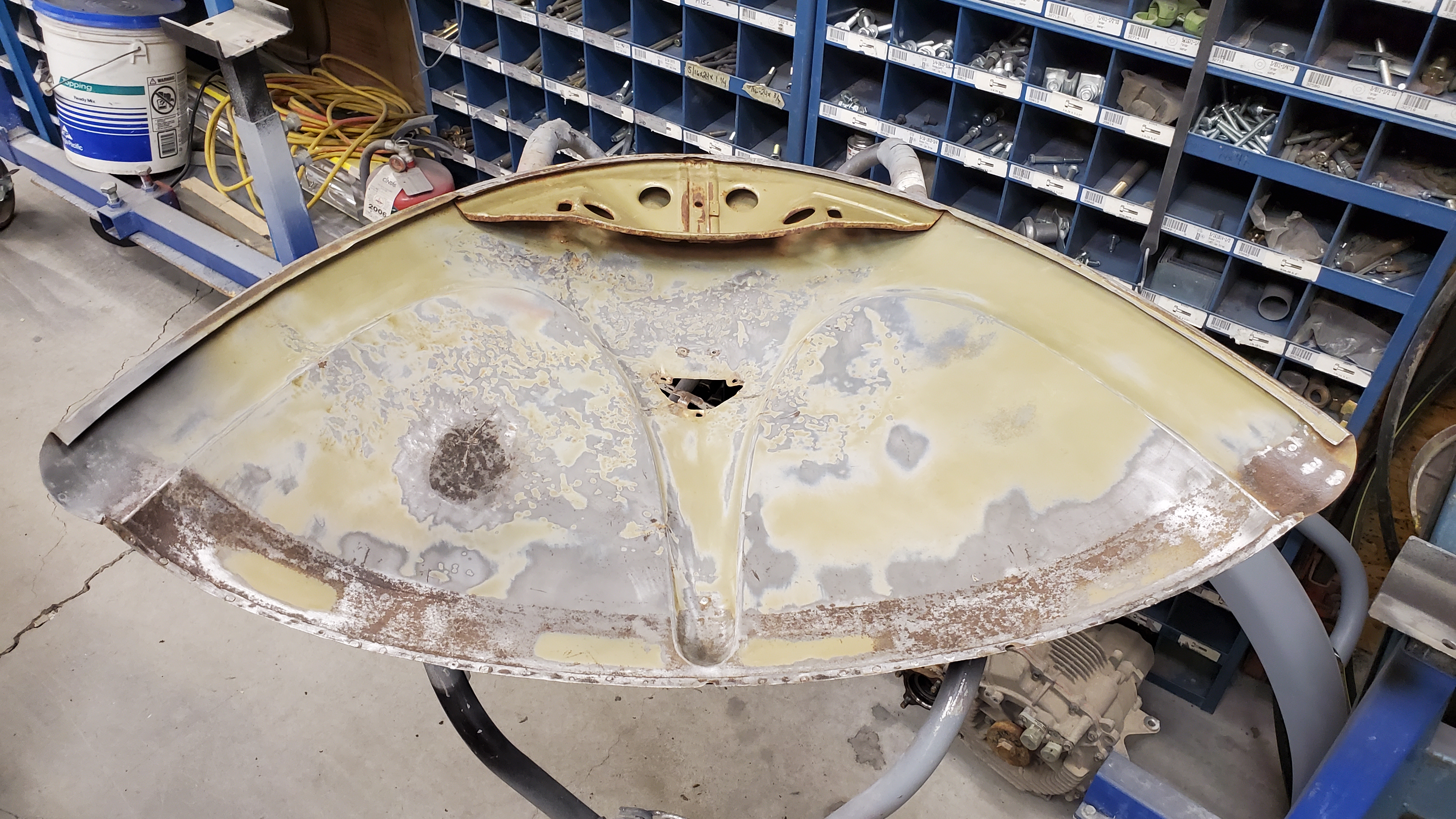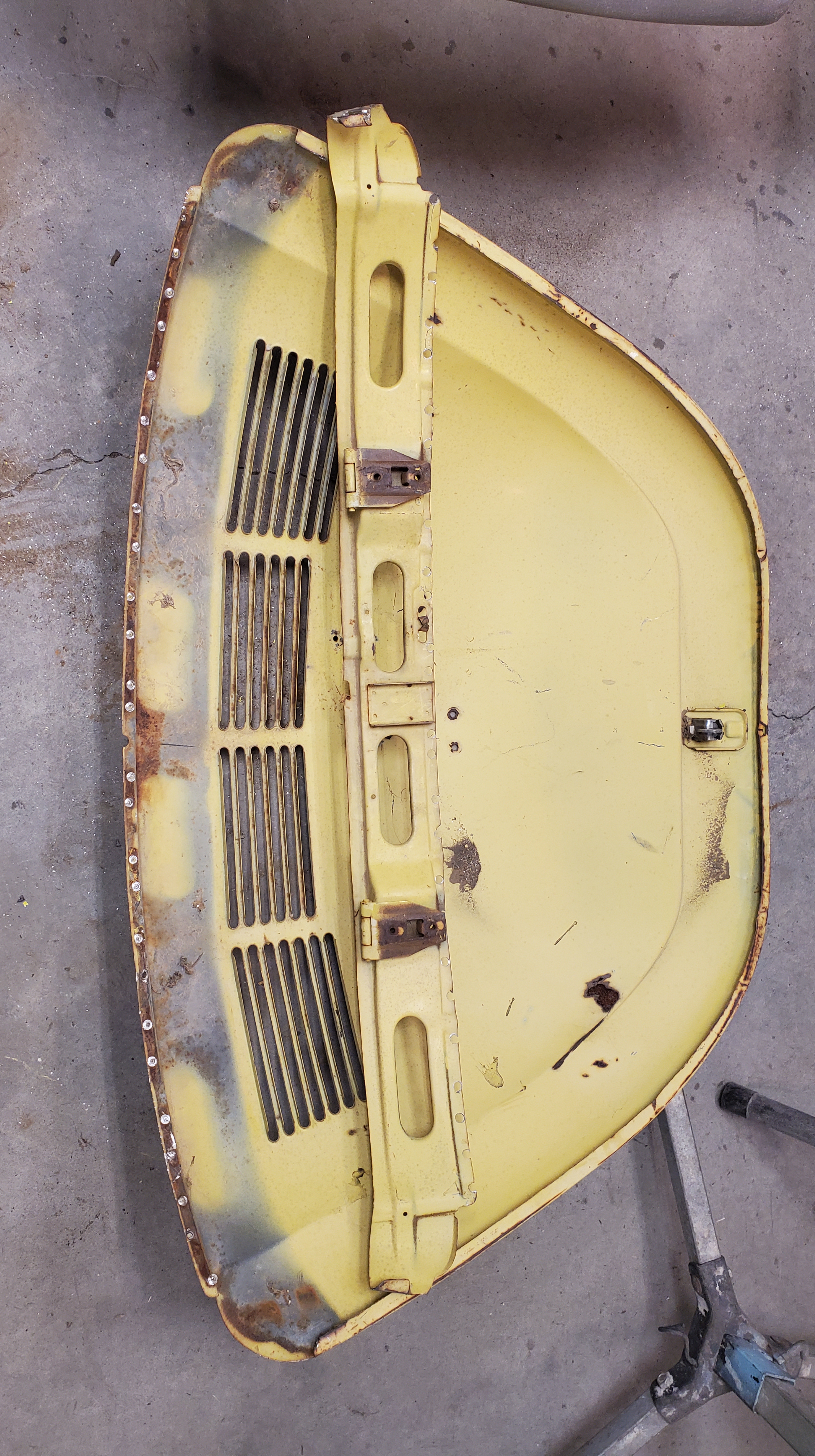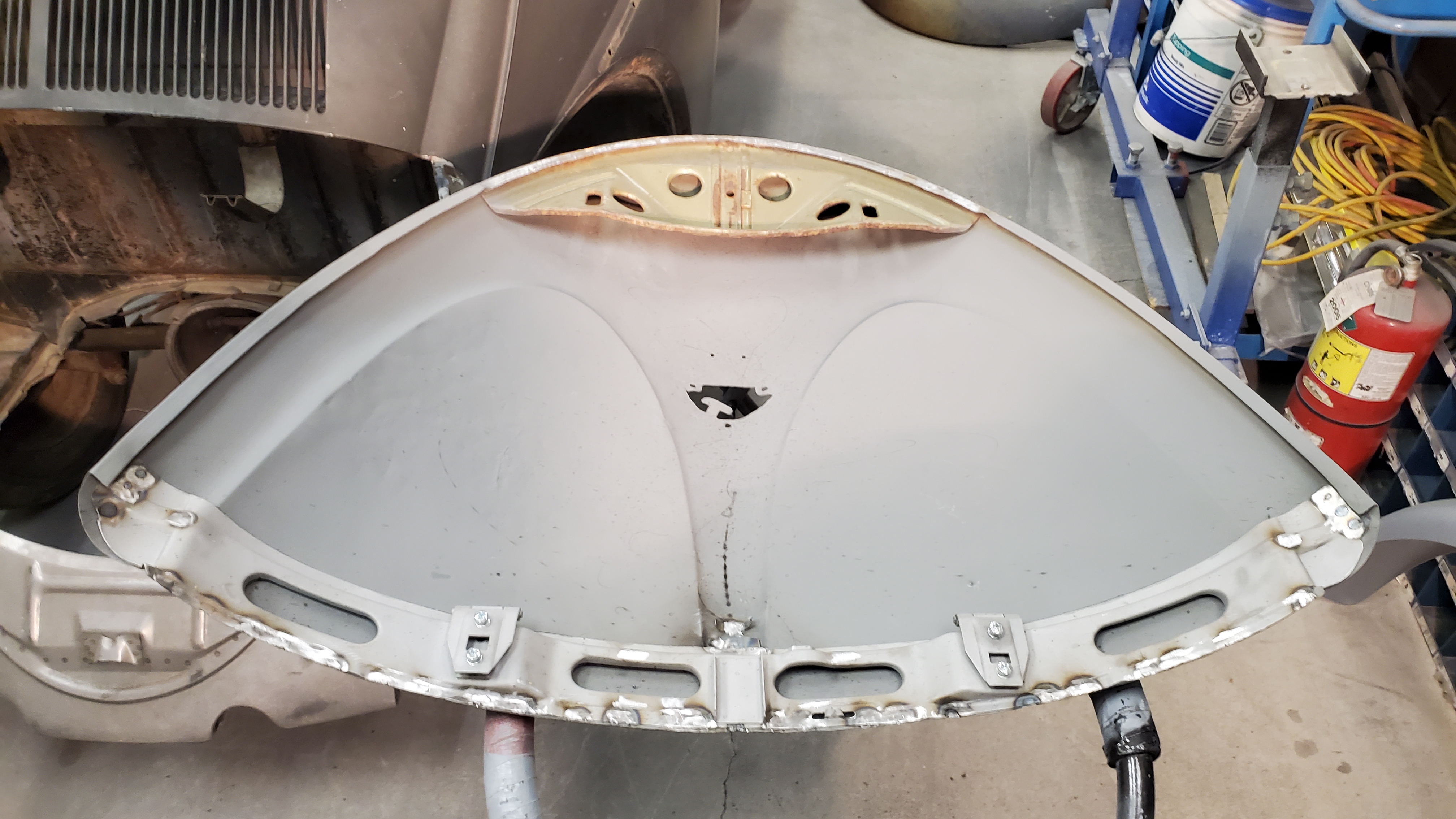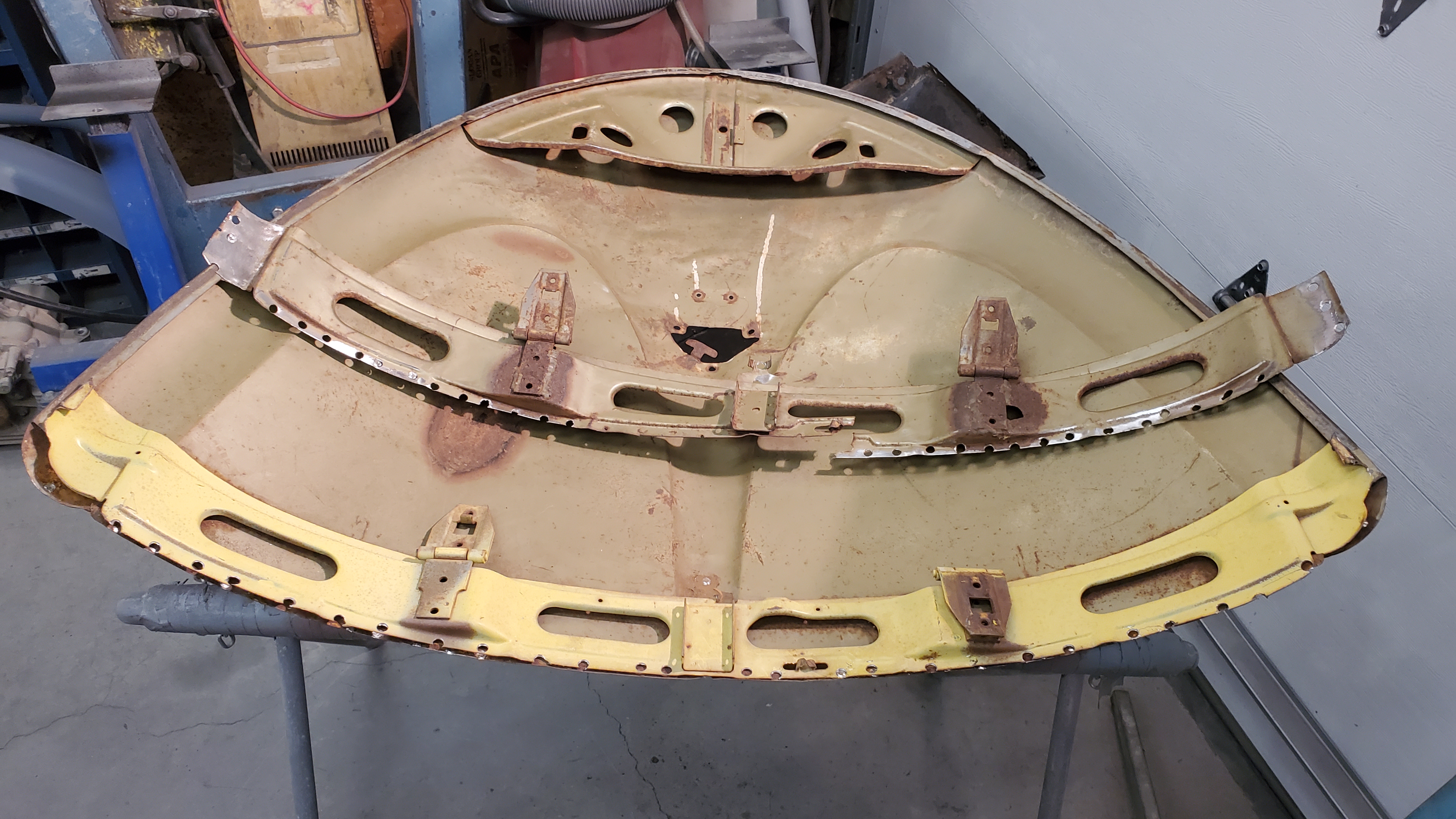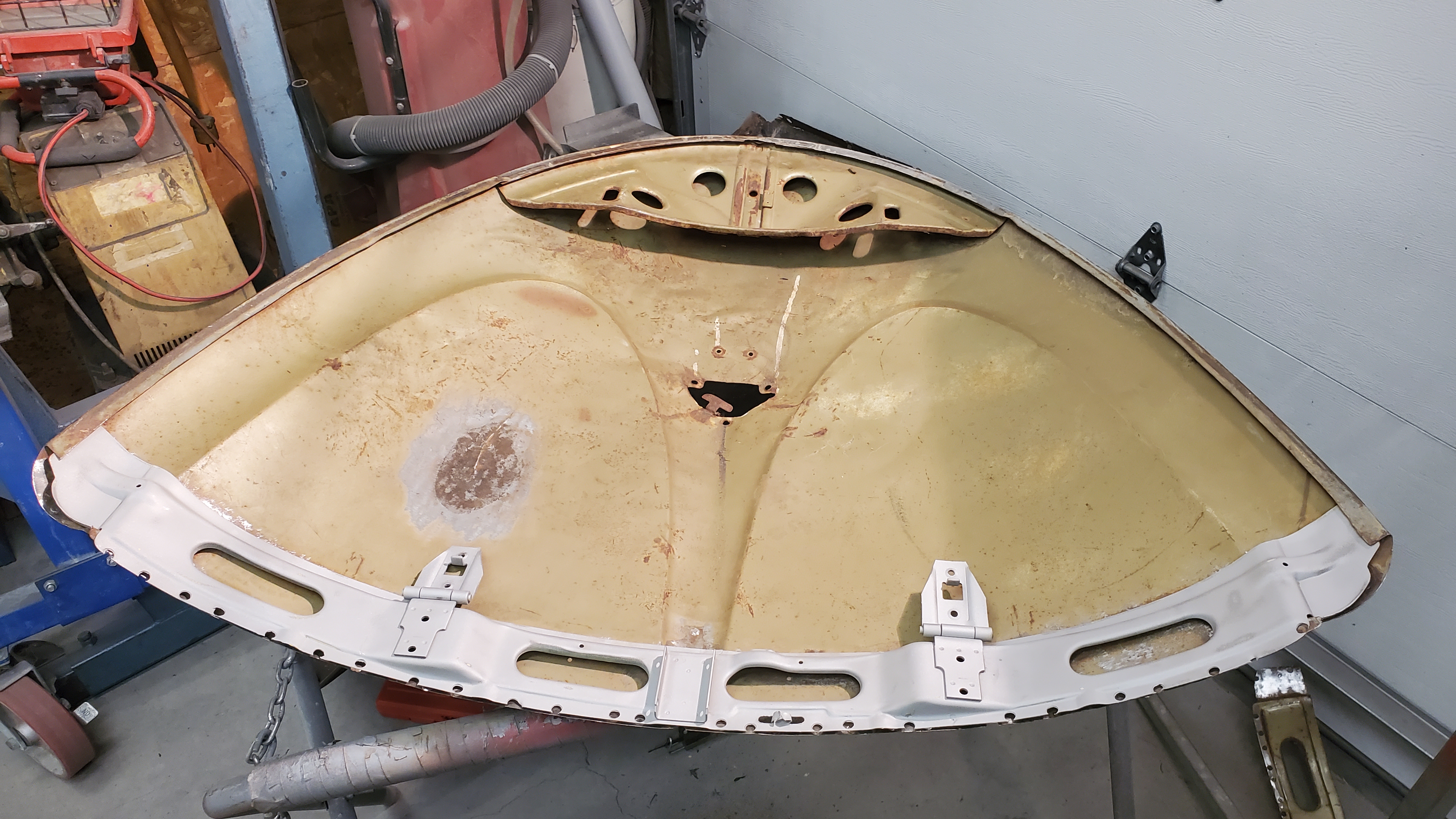 A 1970’s deck lid was used as a donor for the hinge panel needed to repair the W-deck lid.