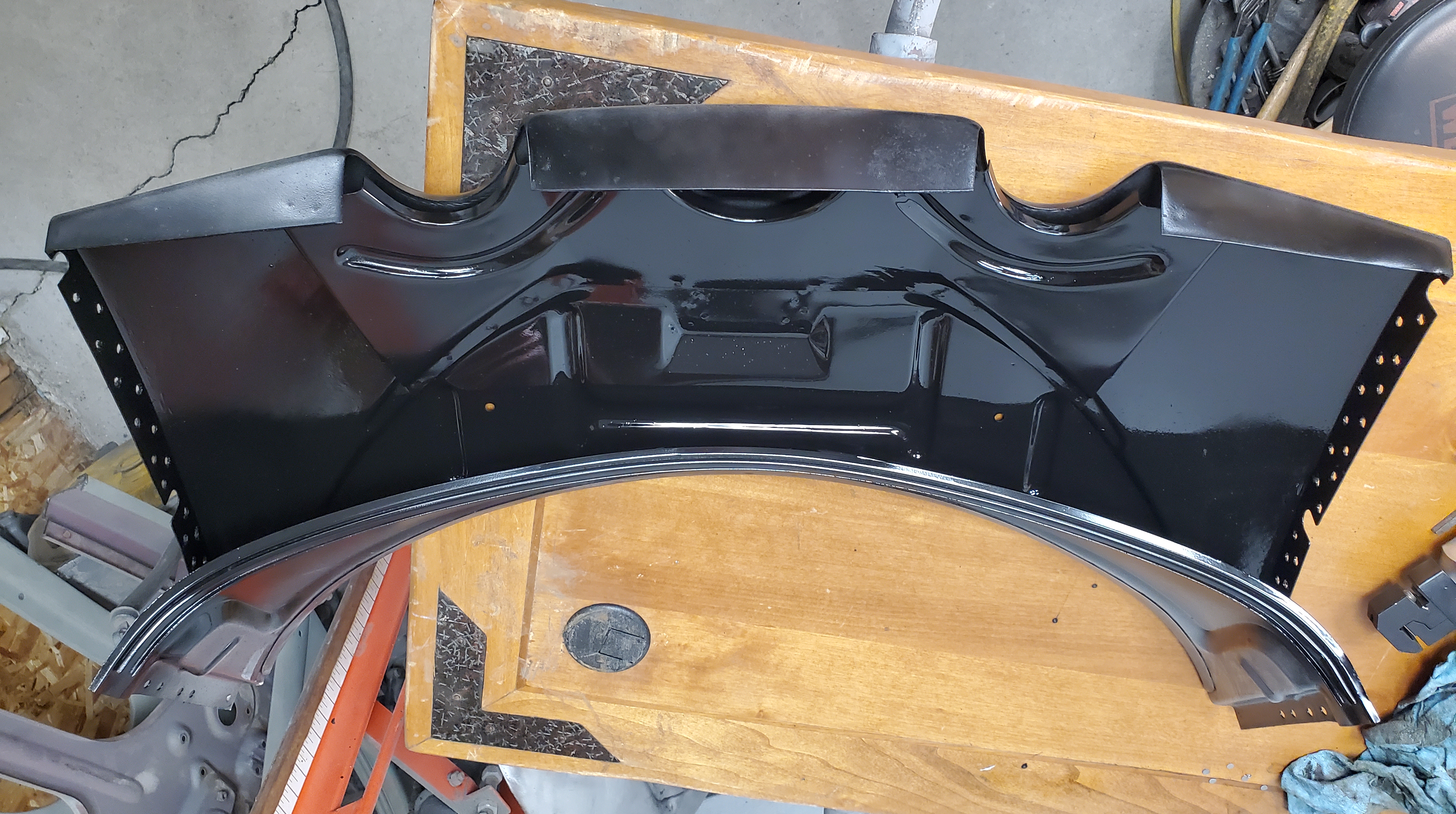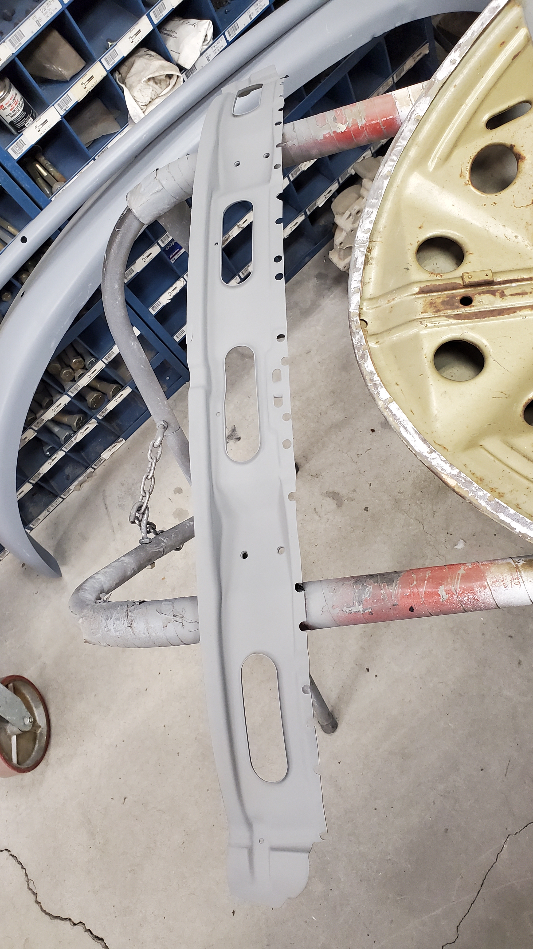 Everything was cleaned, sanded, and painted in the bay. The lip and corners of the panels are painted in weld-through primer for the new panels to be installed. All repair panels are painted on the interior surface before being installed, and holes punched/drilled for mounting.