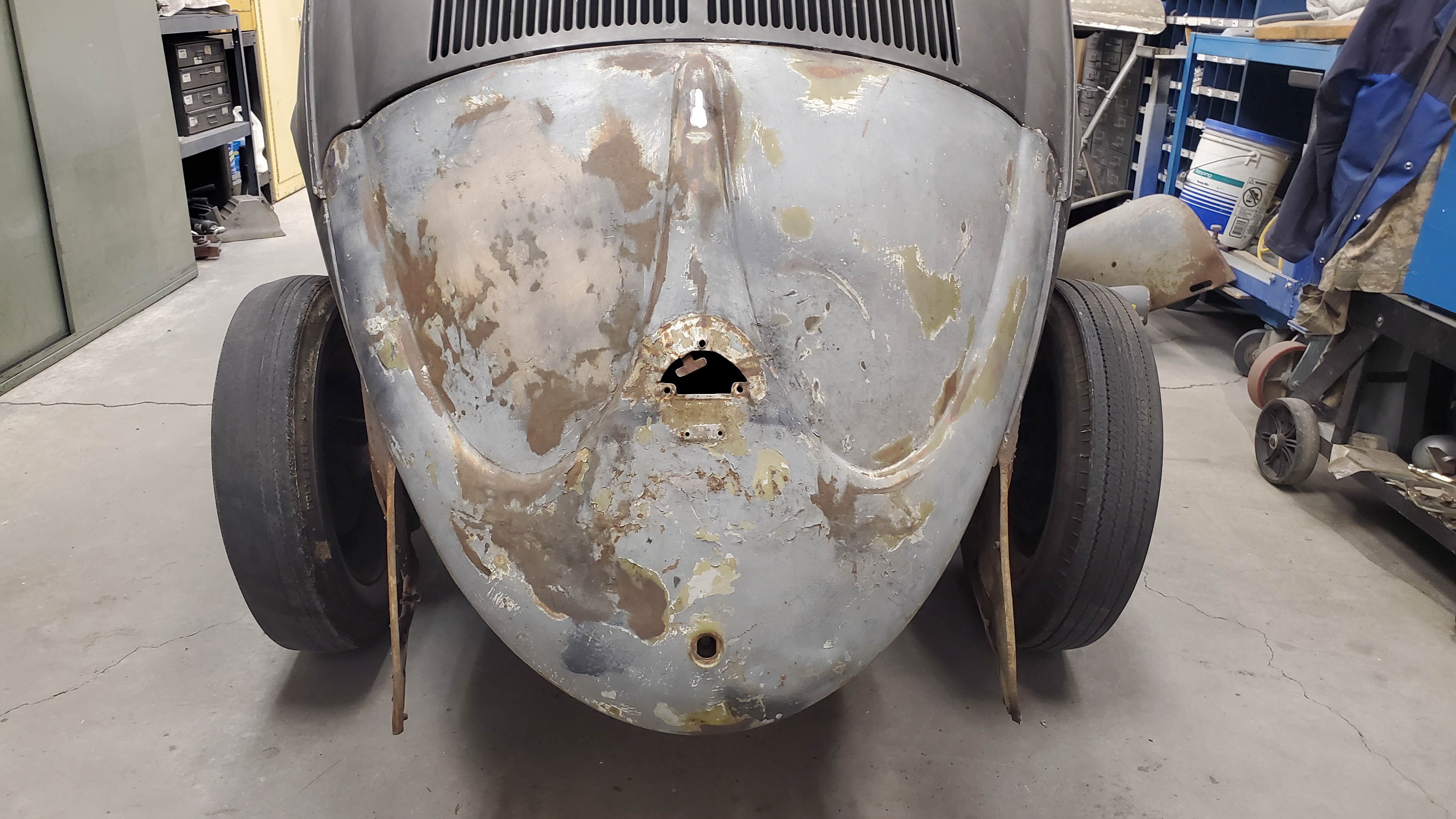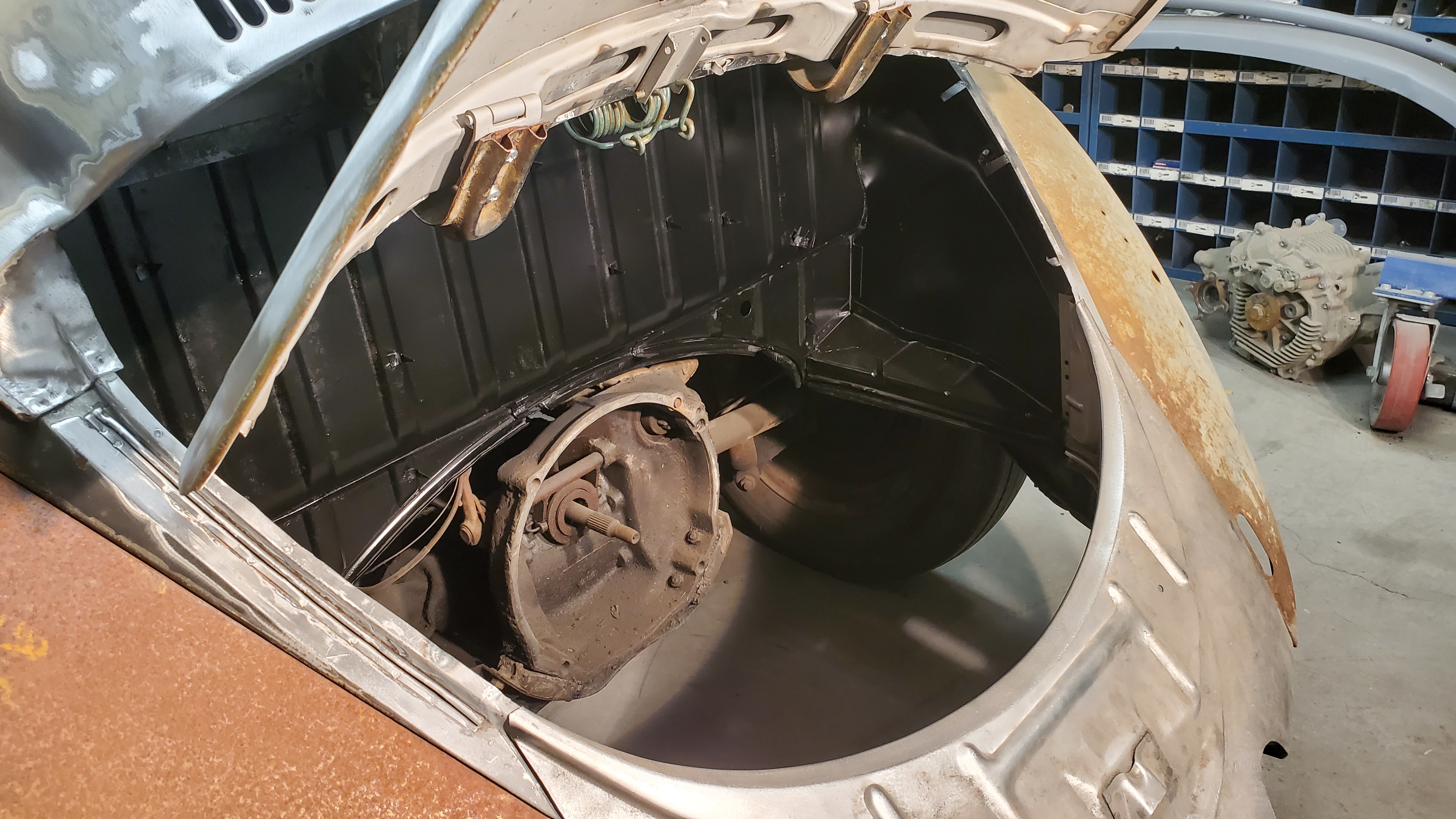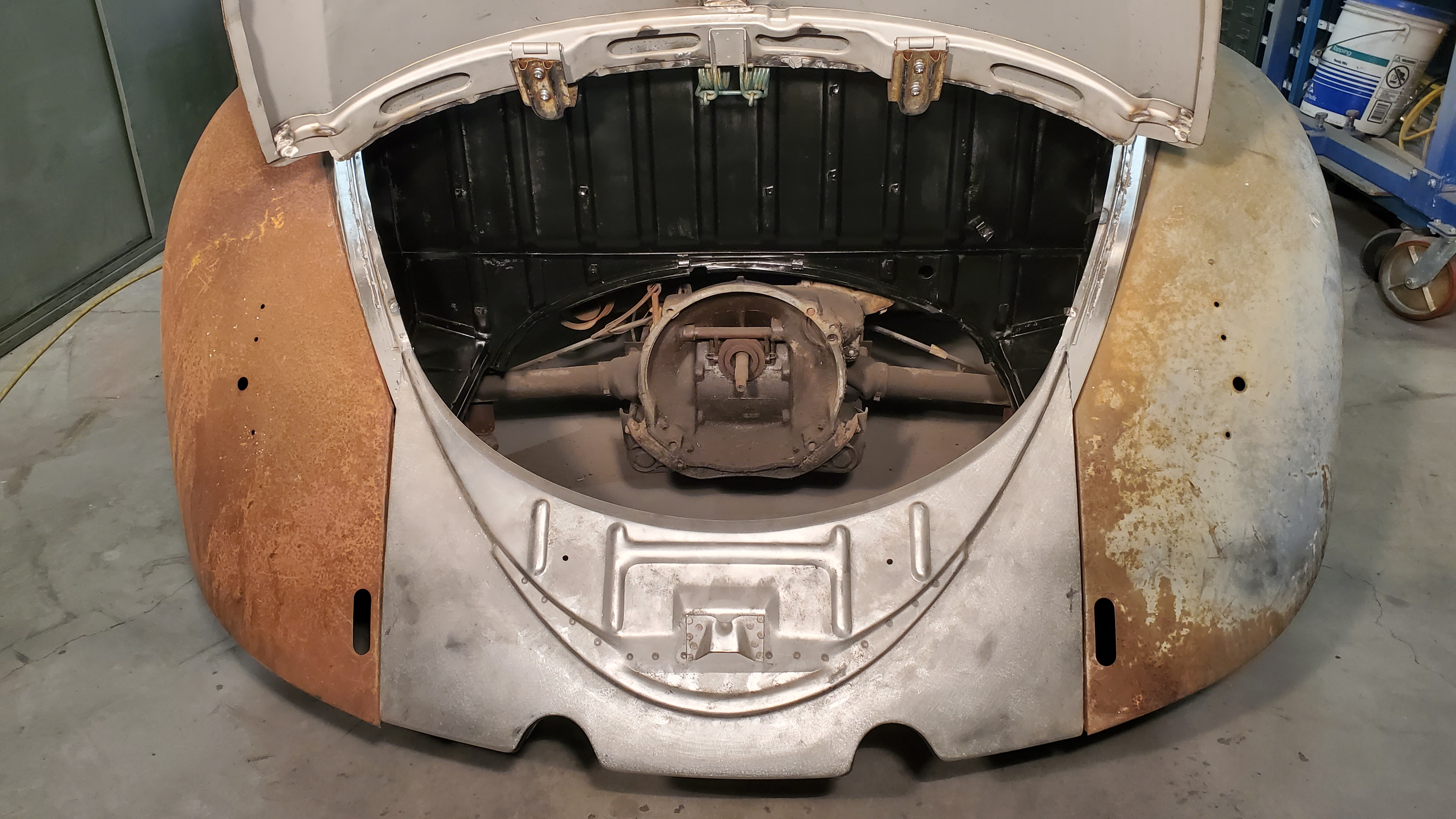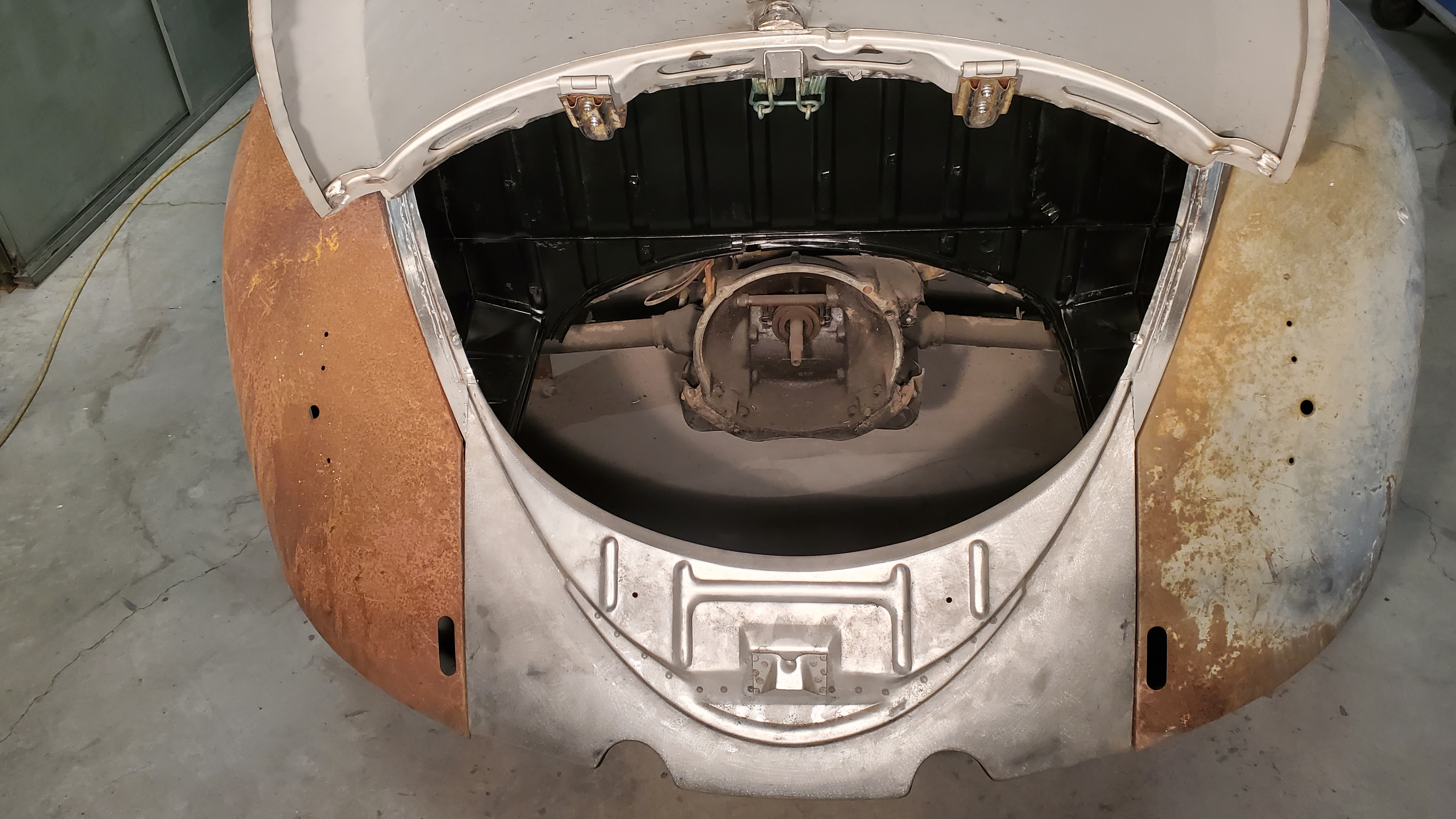 I am starting at the rear of vehicle with this project. The car was hit in the rear at some point, there is rust in the bumper brackets, and the lower nuts in the apron will need to be replaced. The rear apron had seen better days and the rear was in need of some straightening. There is a W-deck lid from another vehicle that will need some work, but is an original.