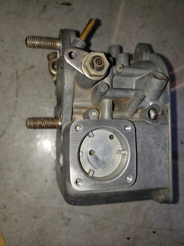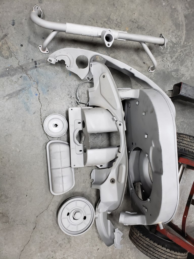 The tin was blasted, oil cooler welded (the mounting tab had a crack), mating surfaces filed, carburetor rebuilt, and surfaces sanded.