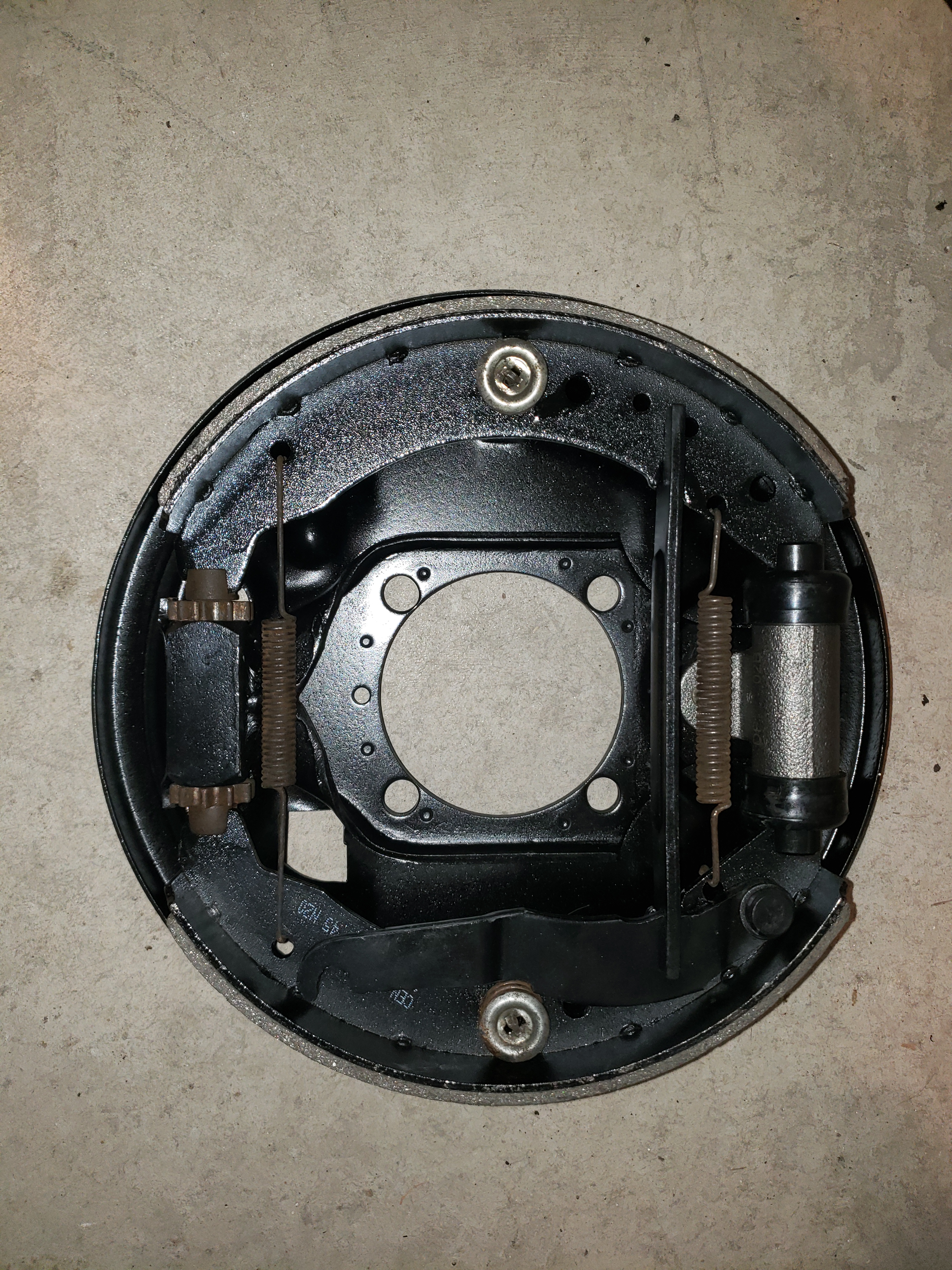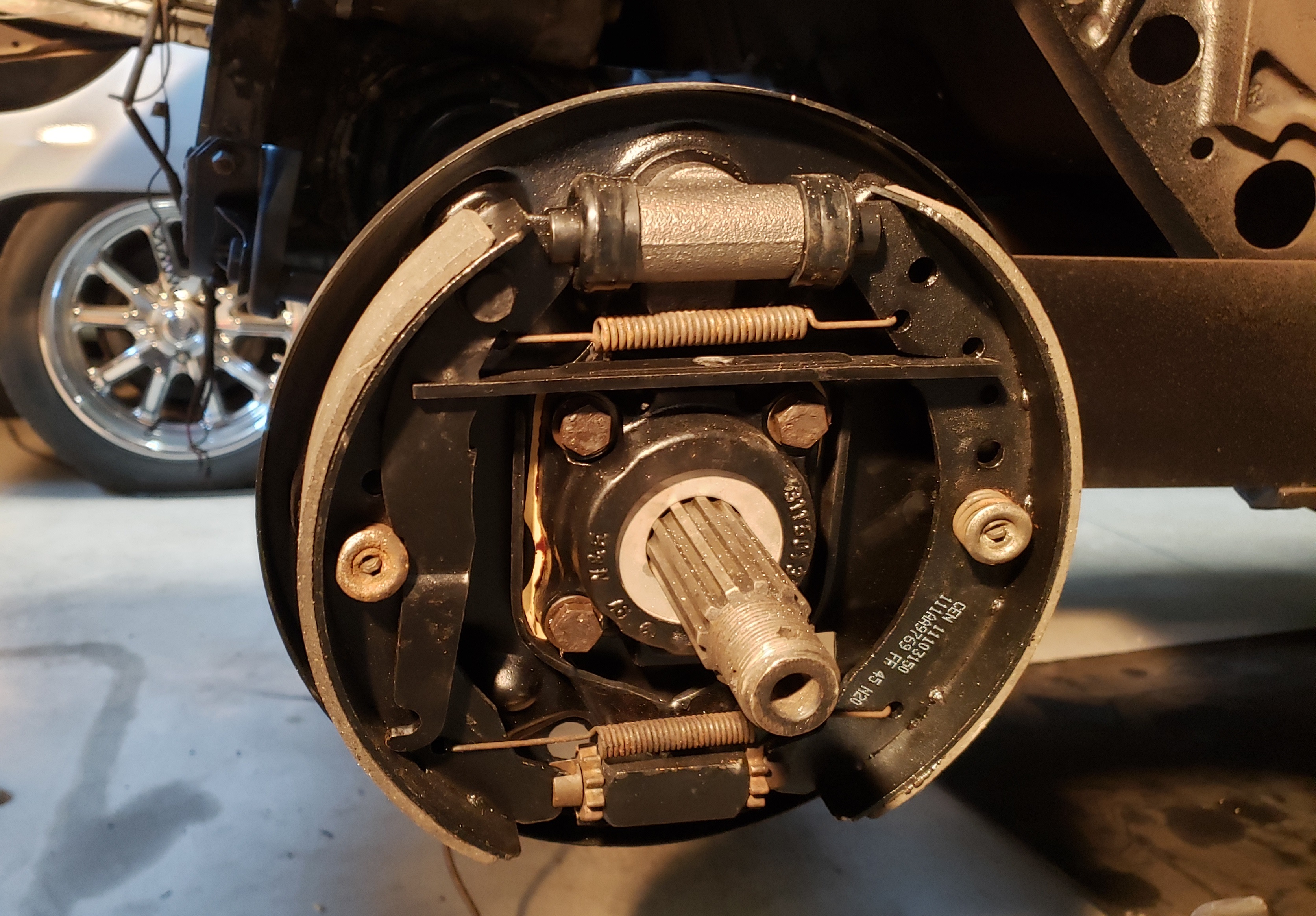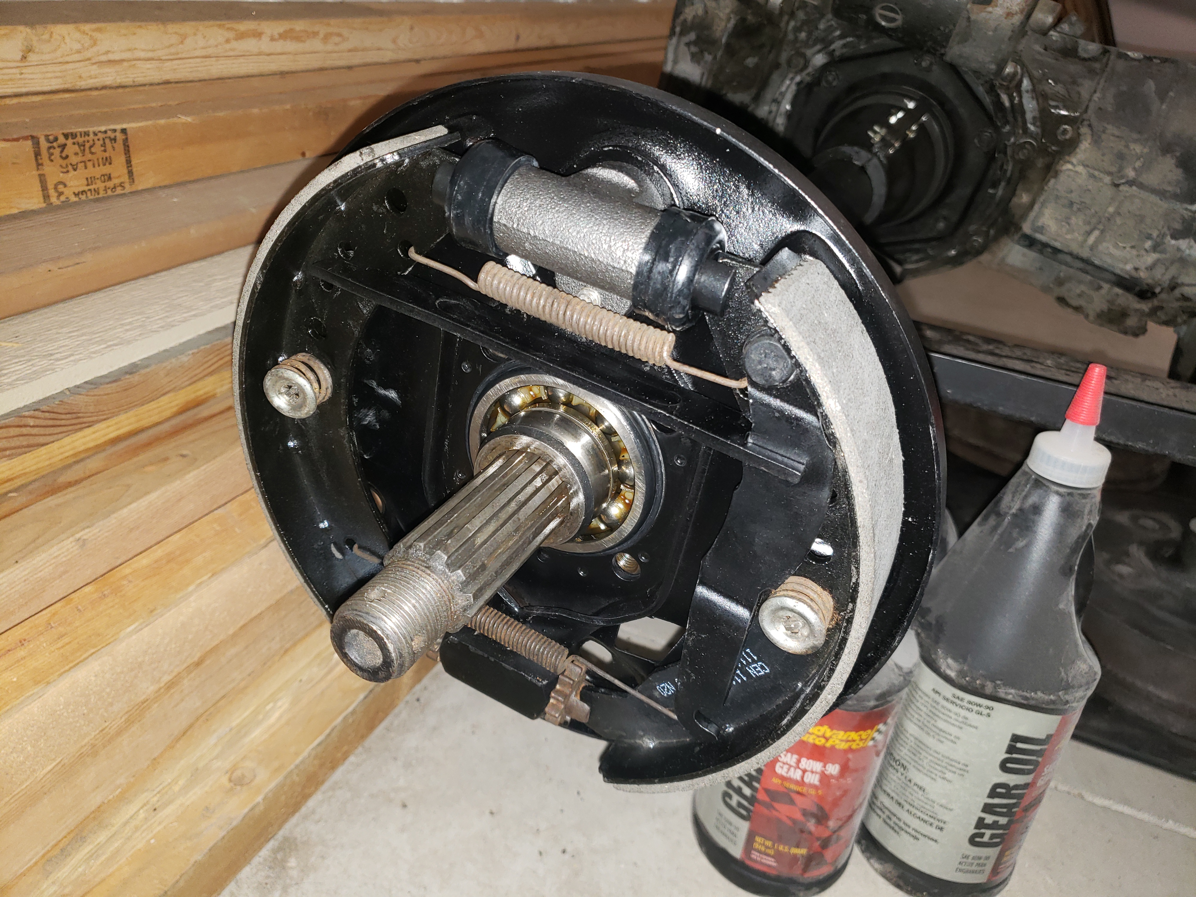 The backing plates and bearing caps were blasted. Everything was painted, new shoes, wheel cylinders, axle boots, and wheel bearing axle seals were installed.