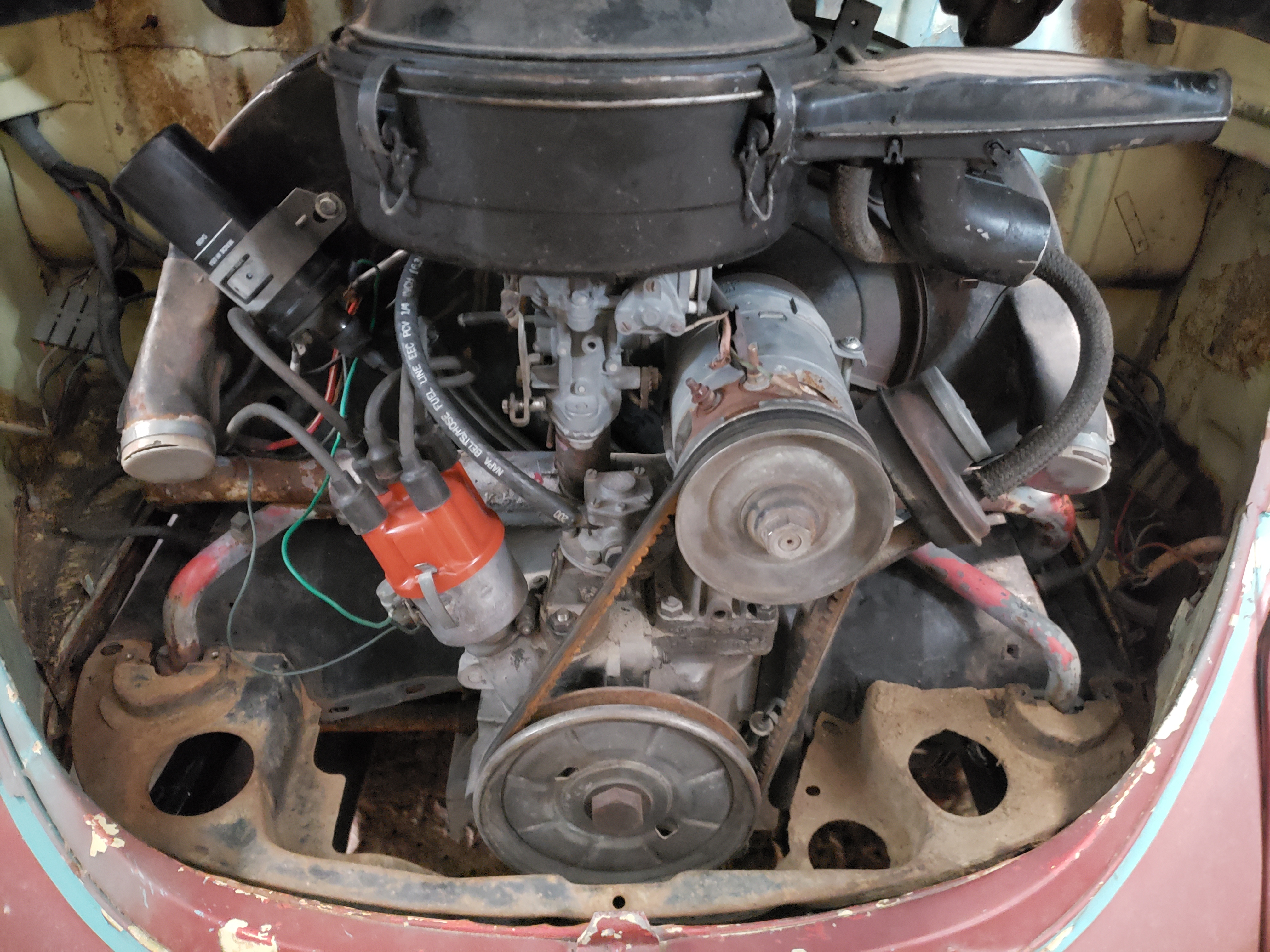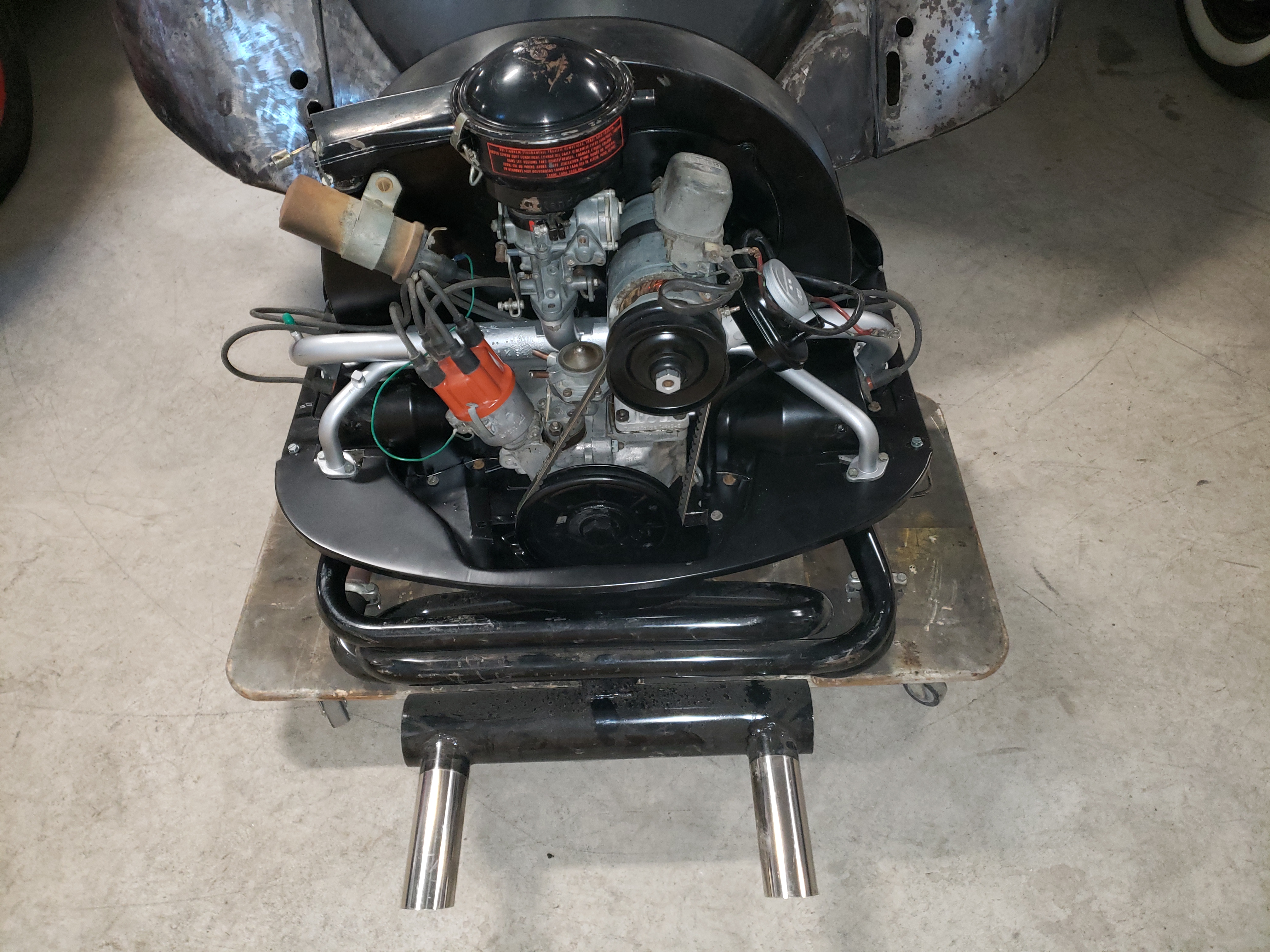 On a cart and almost ready for the car. All new Bosch cap, rotor, points, and wires. New exhaust and v-belt. I had this ready to go in a 6-volt vehicle before it was installed in this car. I changed the 6-volt coil to a 12-volt Bosch Blue, added a rebuilt 12-volt generator, restored the original air cleaner, and installed a new fuel pump from this picture.