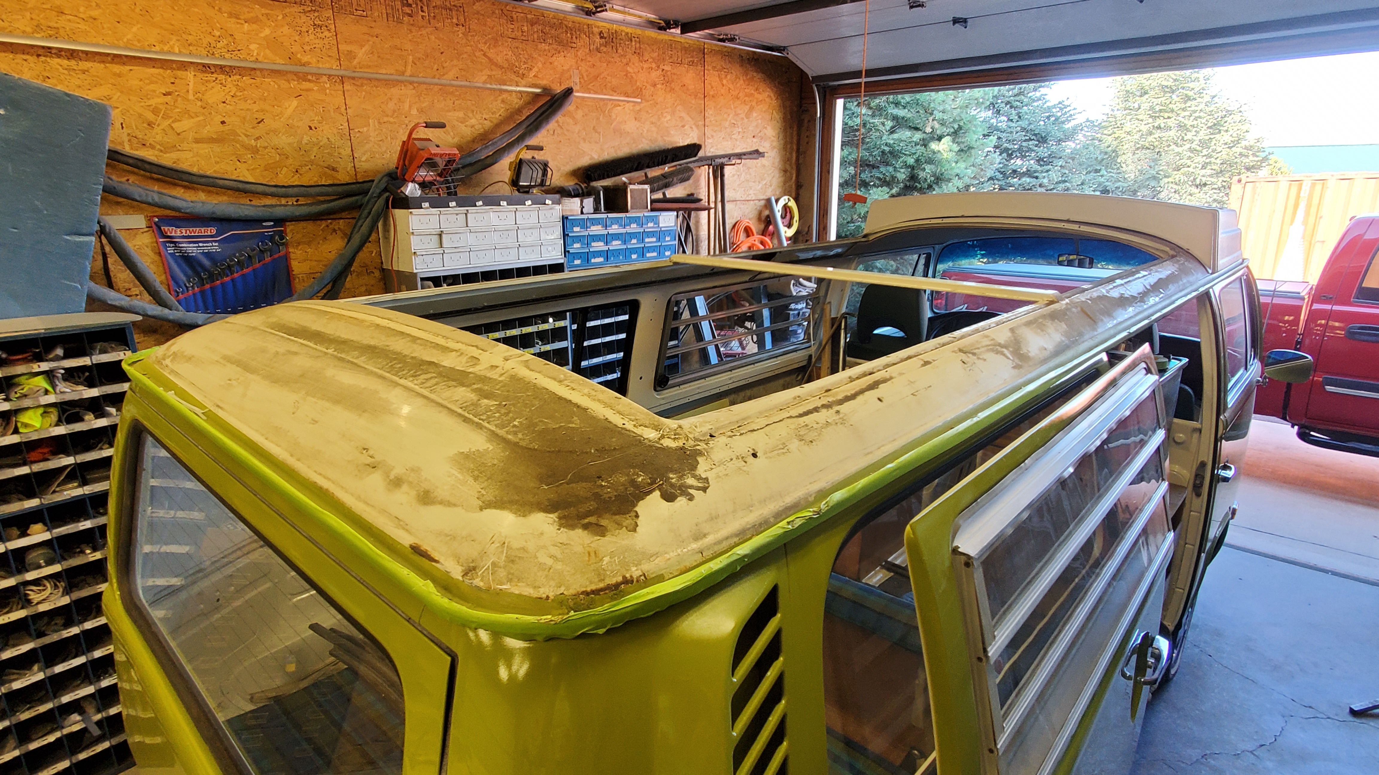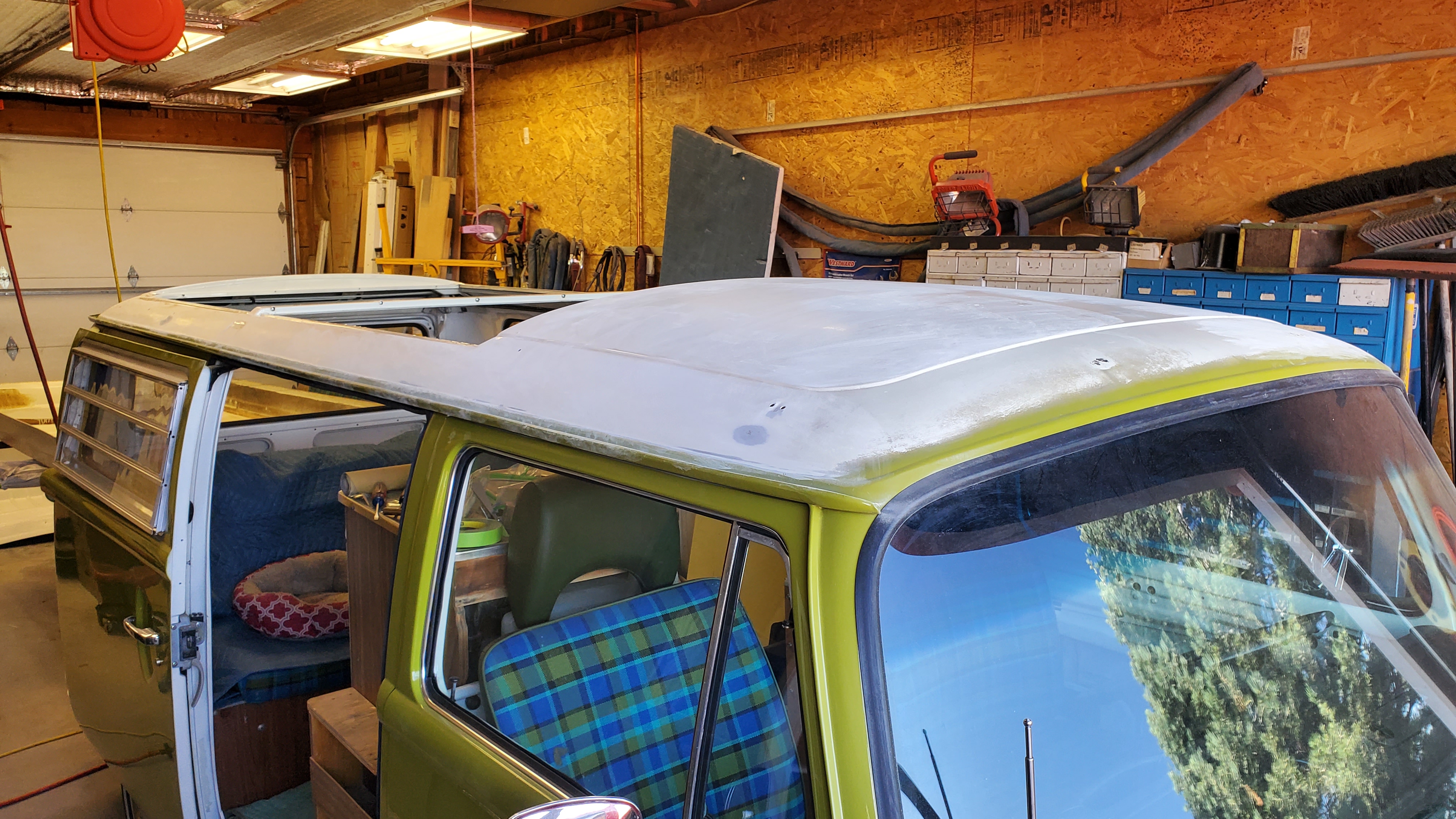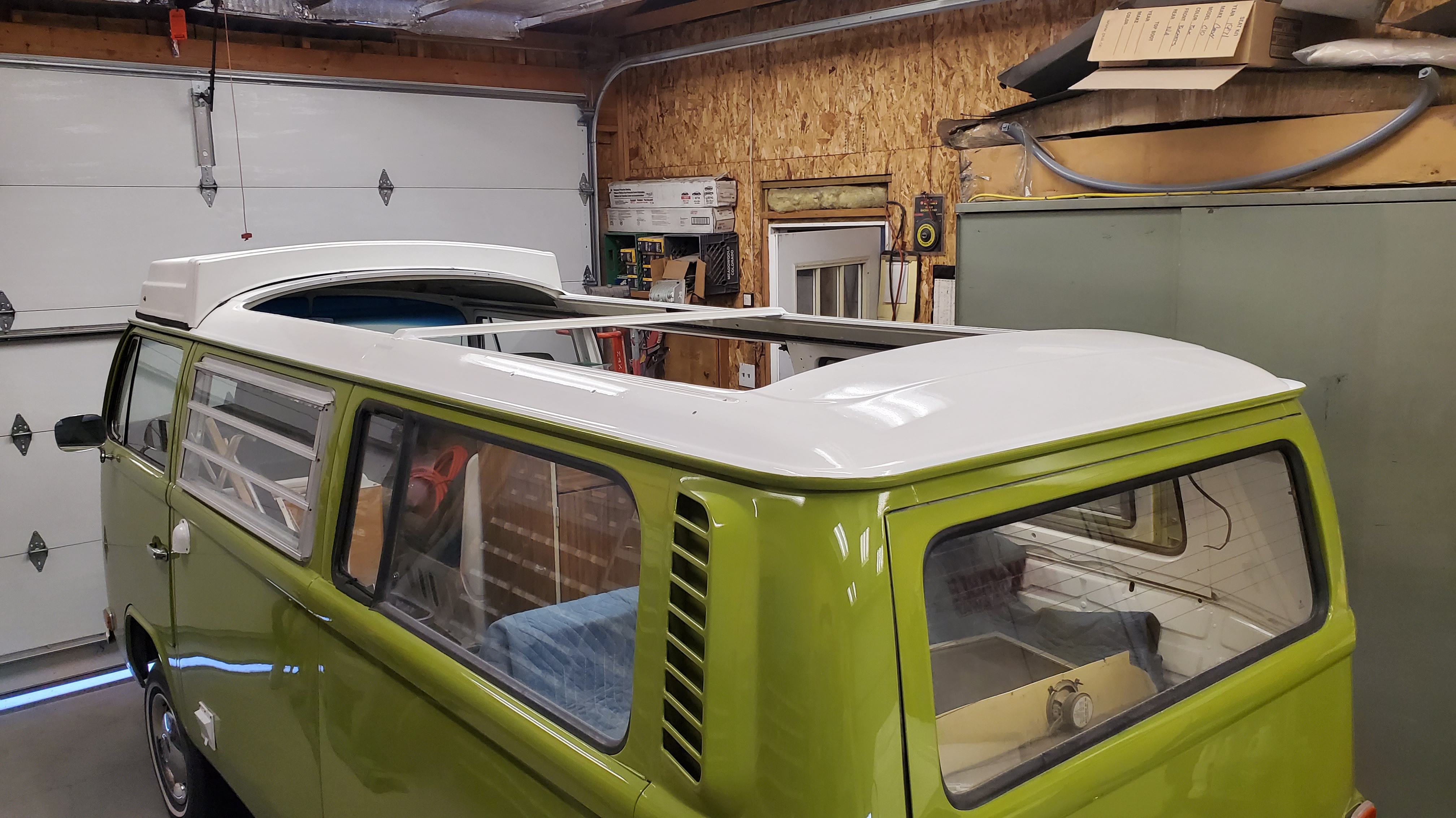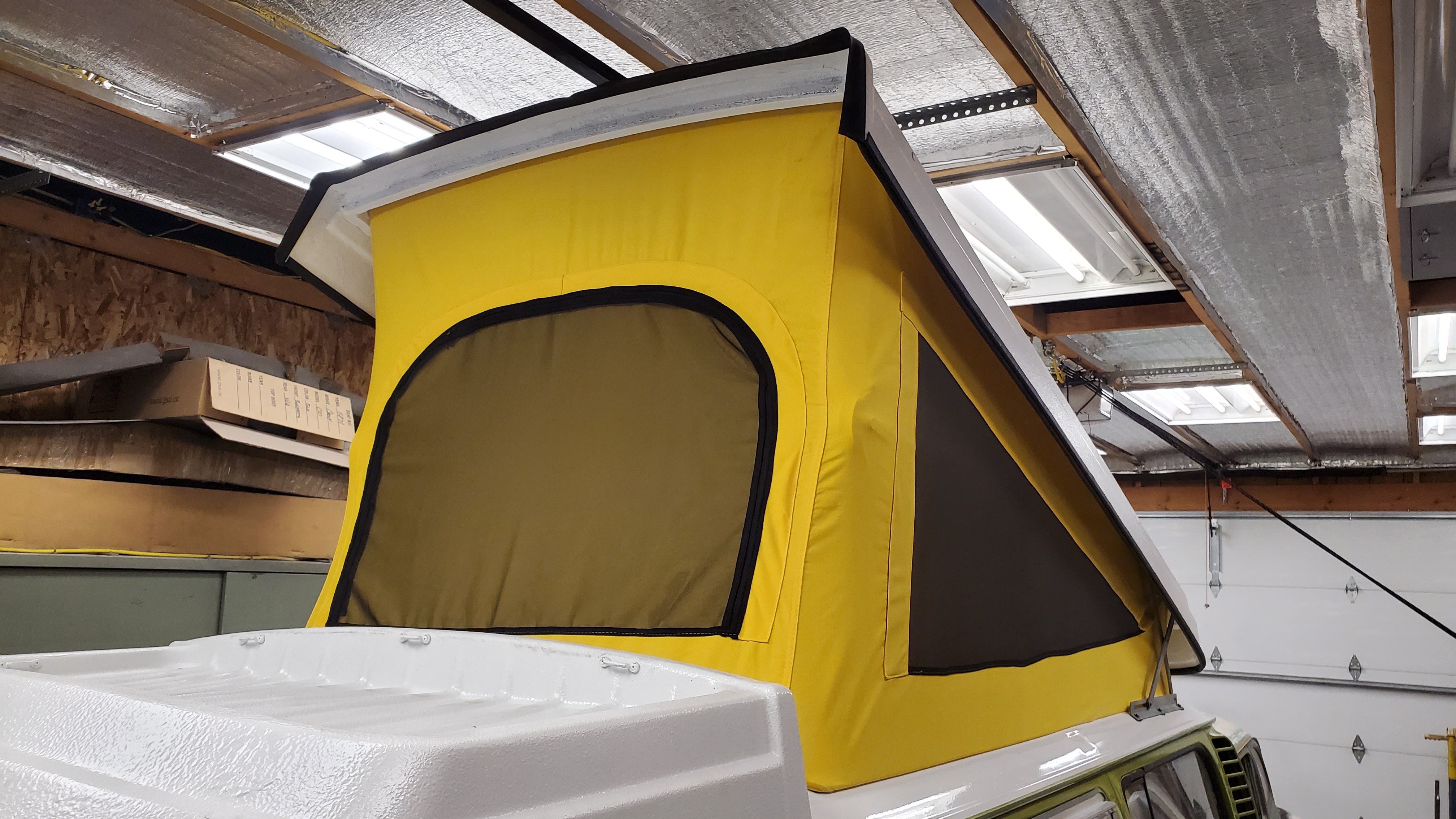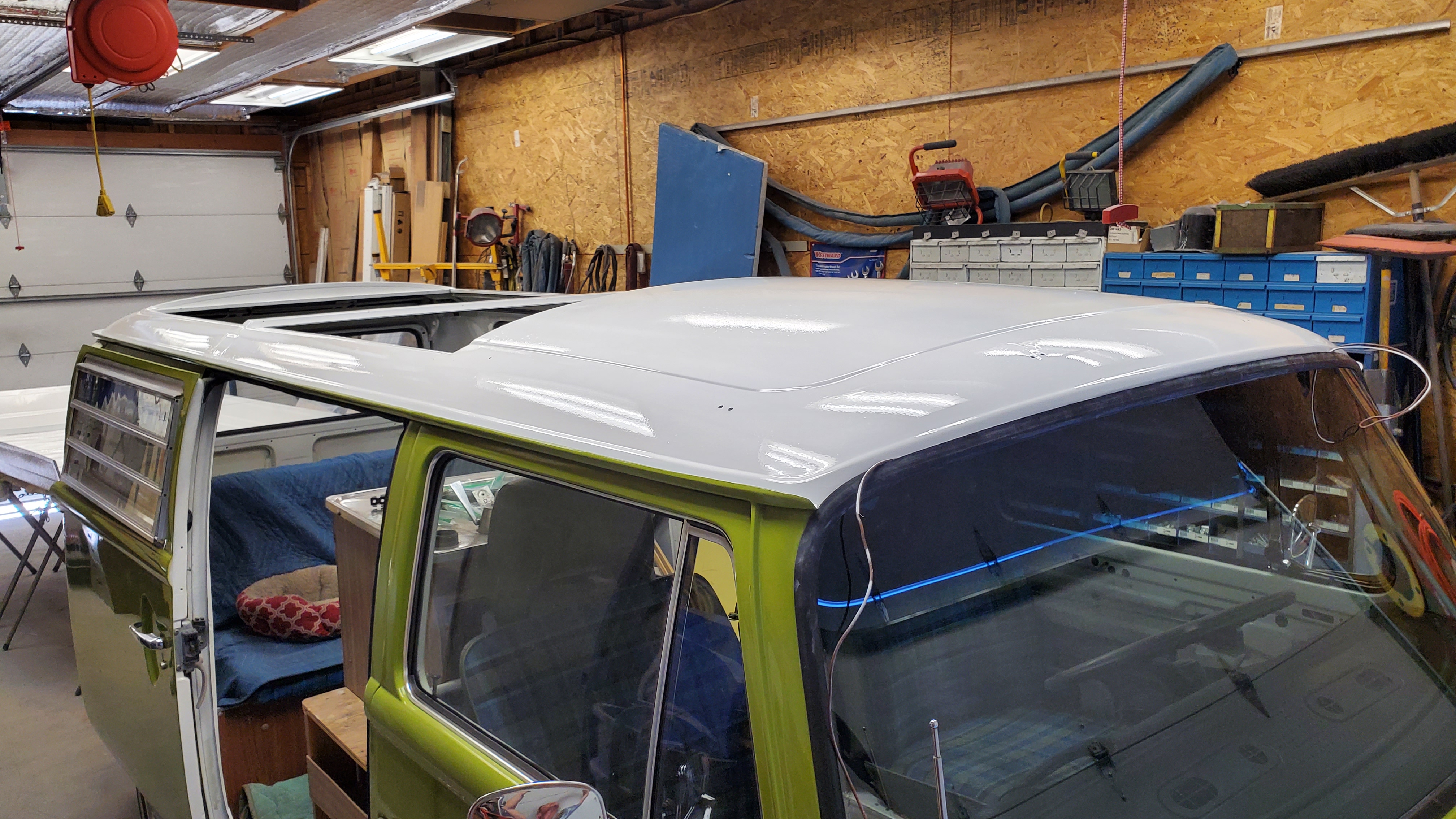 The top was removed to paint the exterior, but they skipped the roof and inside the pop-top.