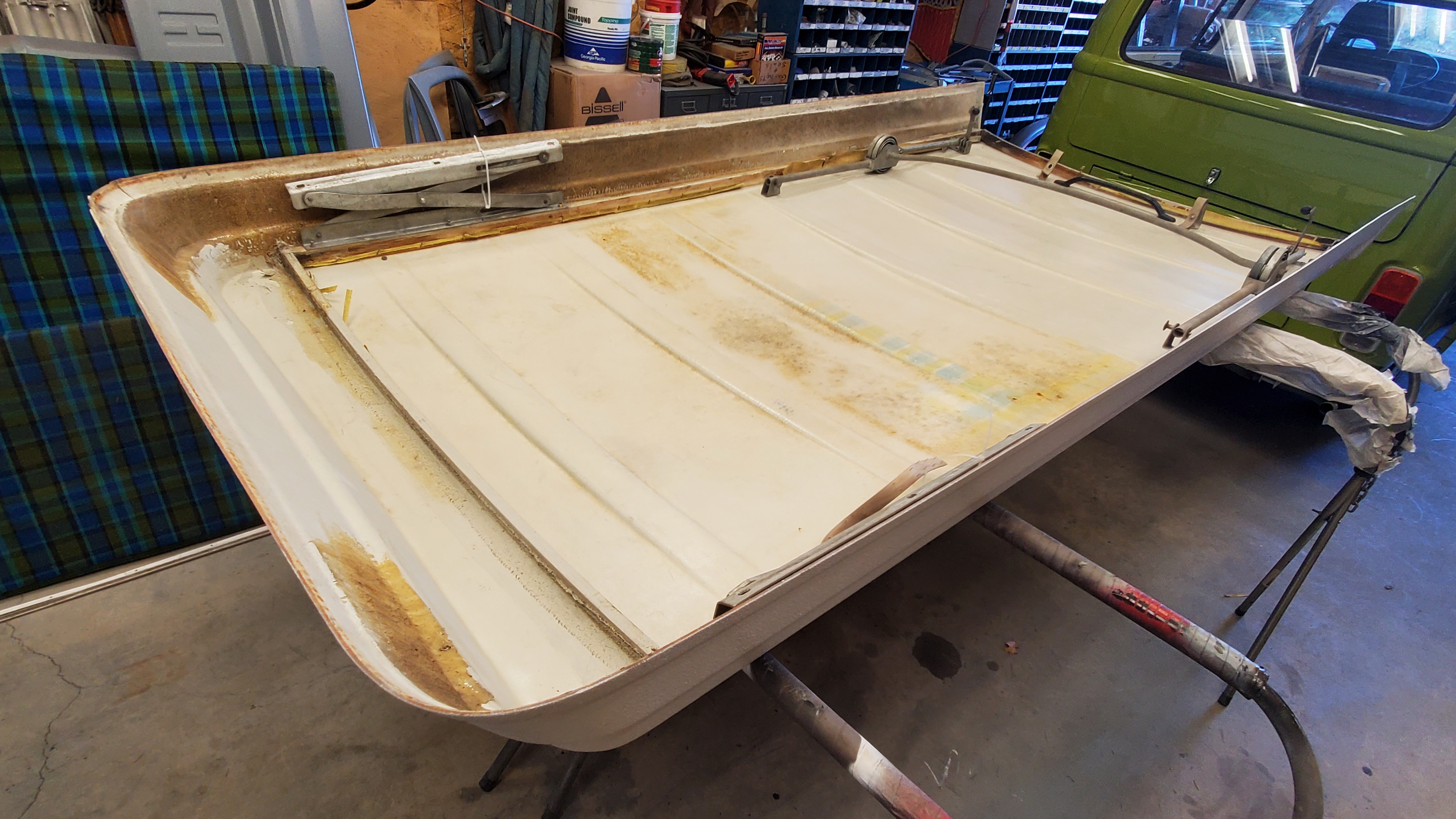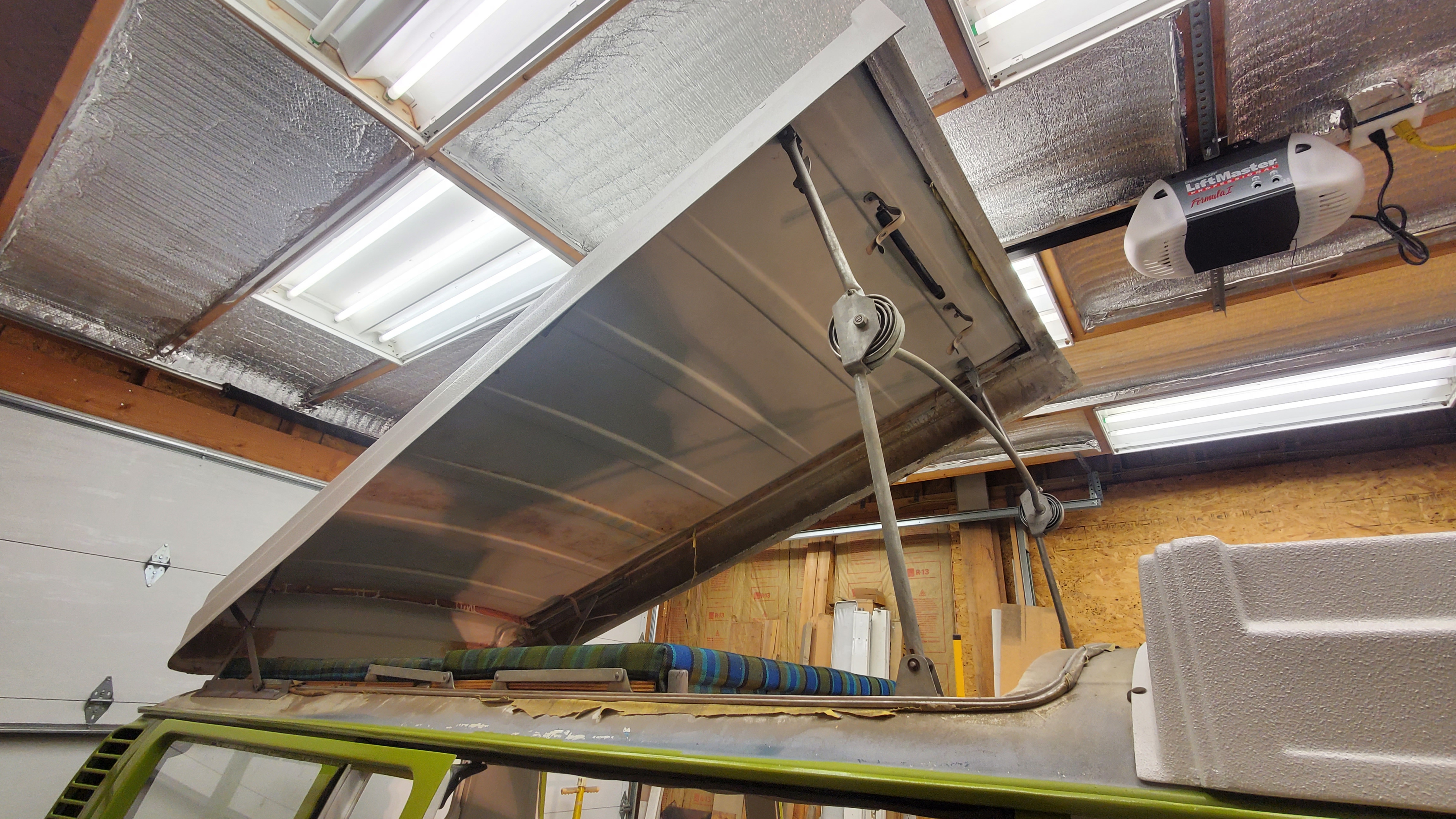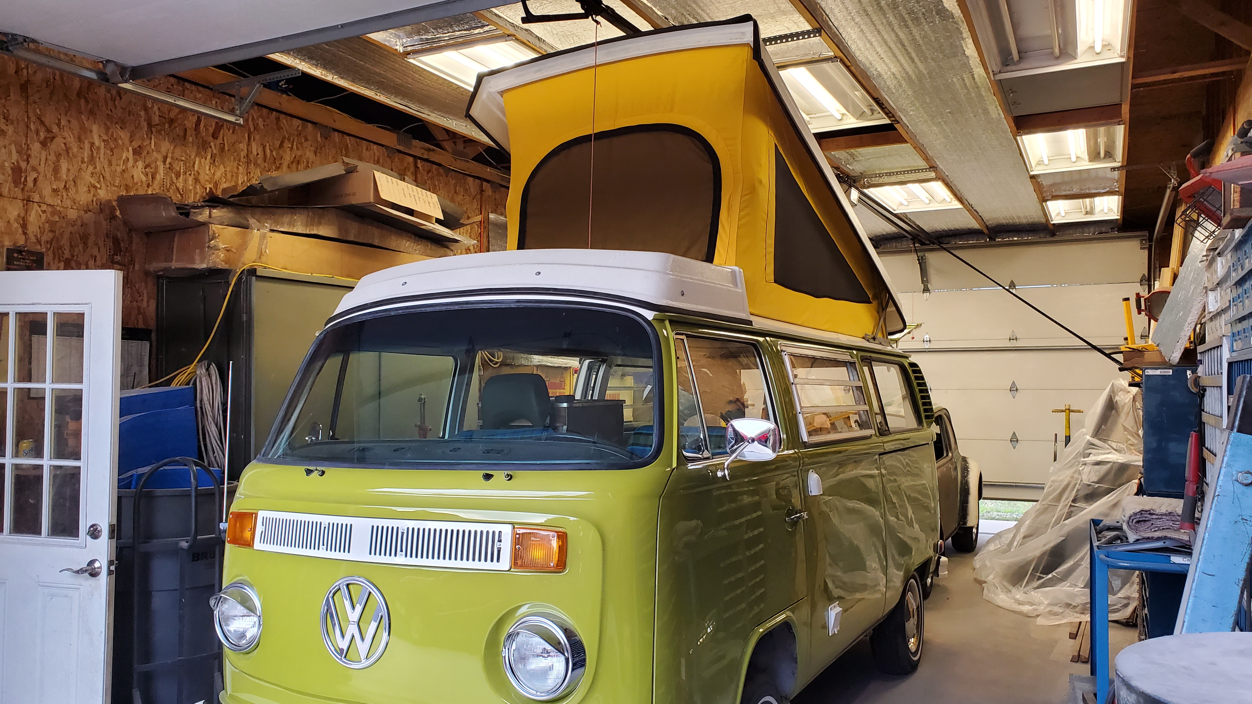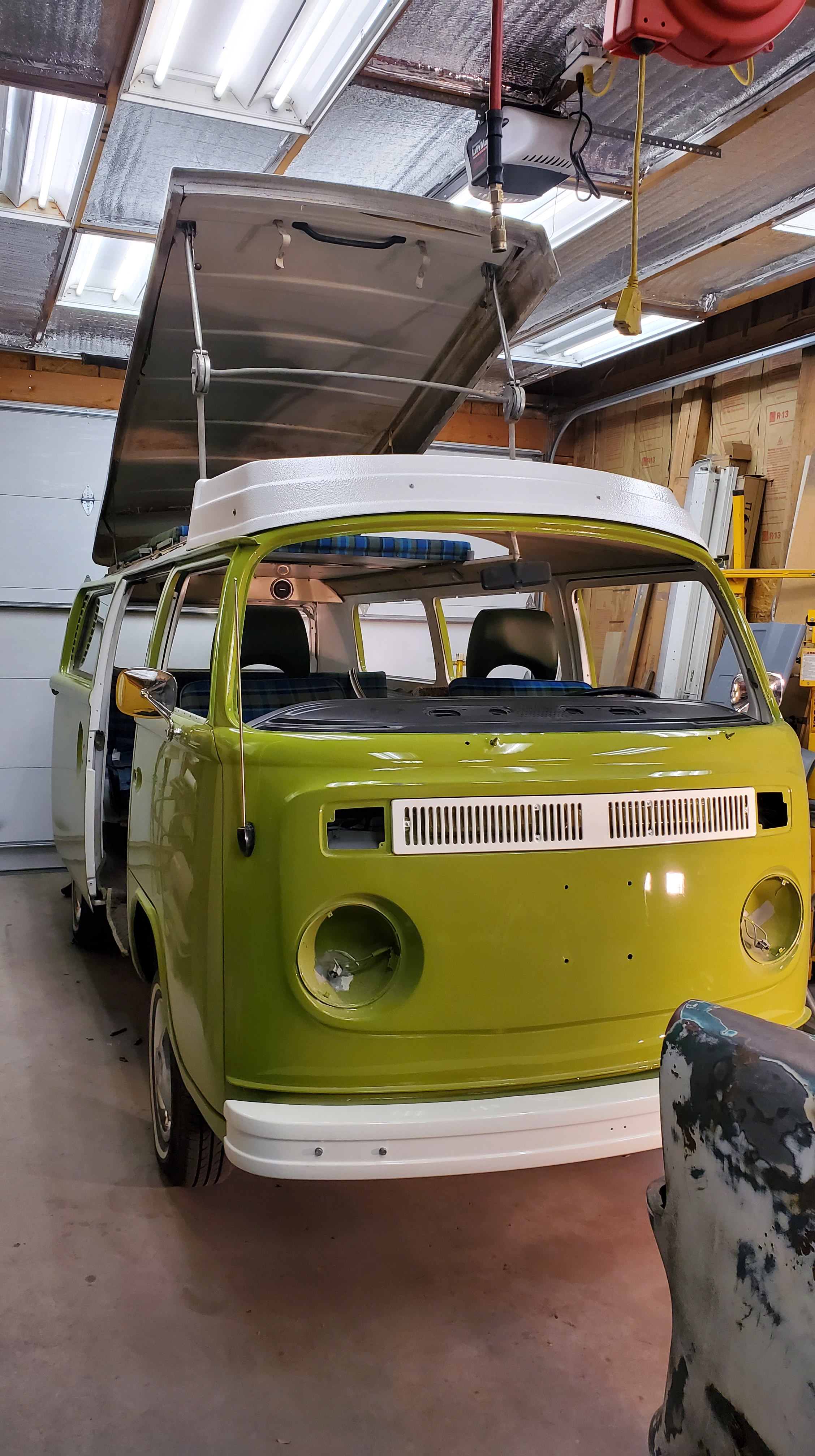 The top was removed to paint the exterior, but they skipped the roof and inside the pop-top.