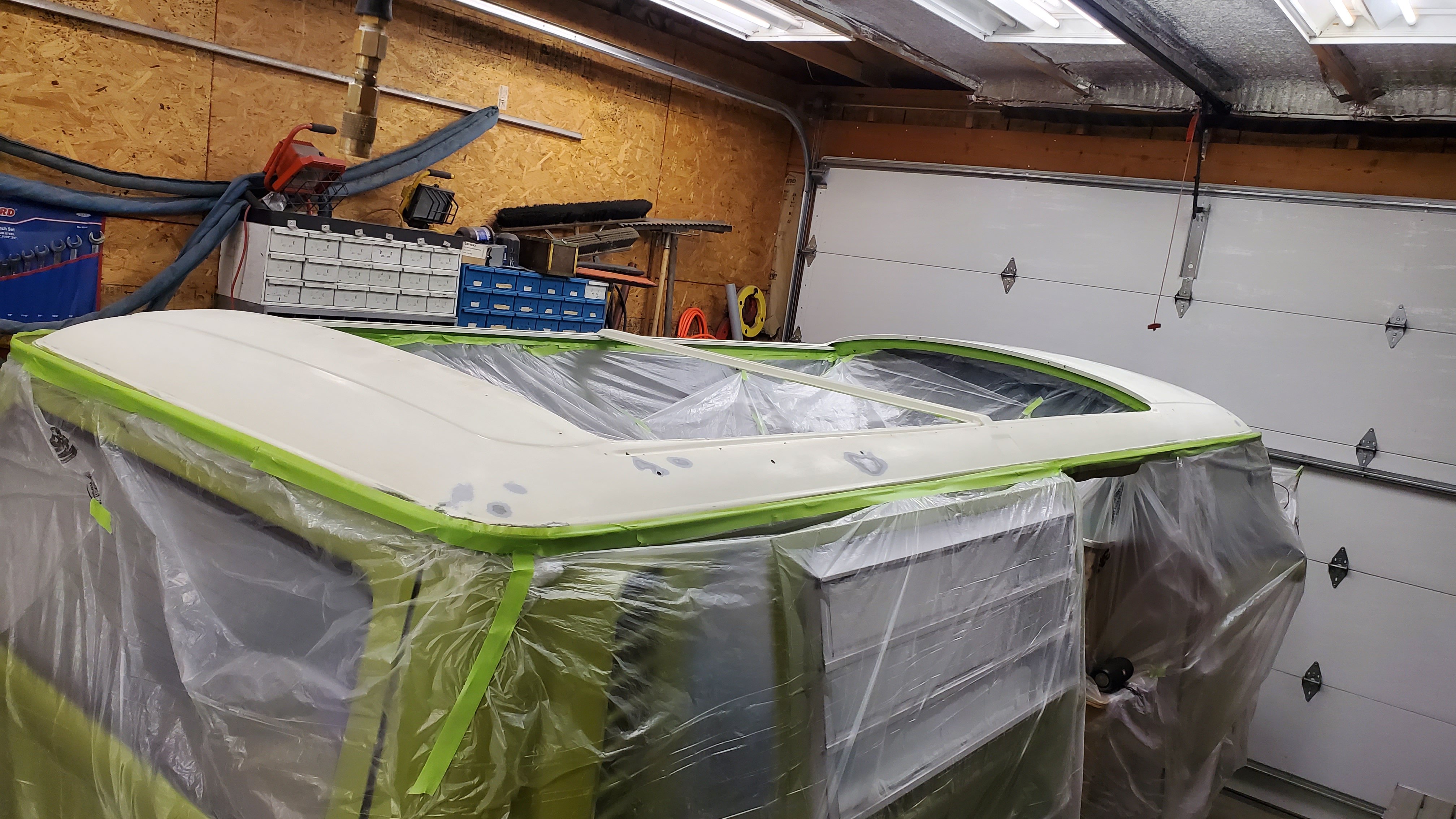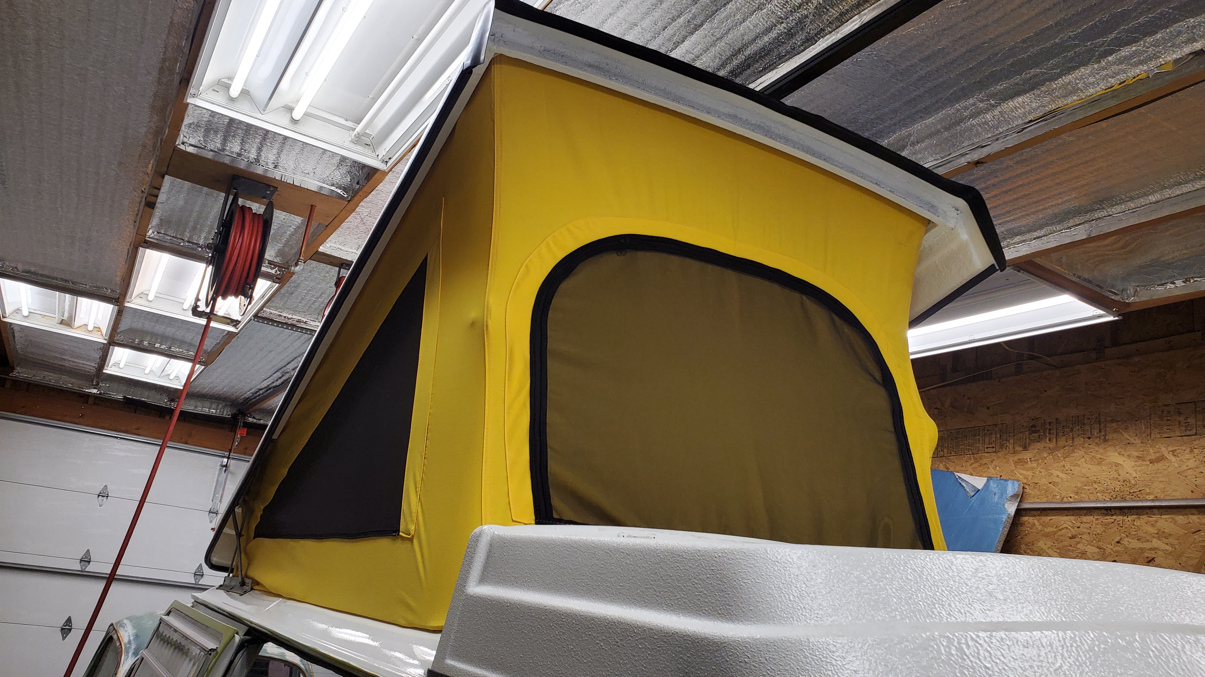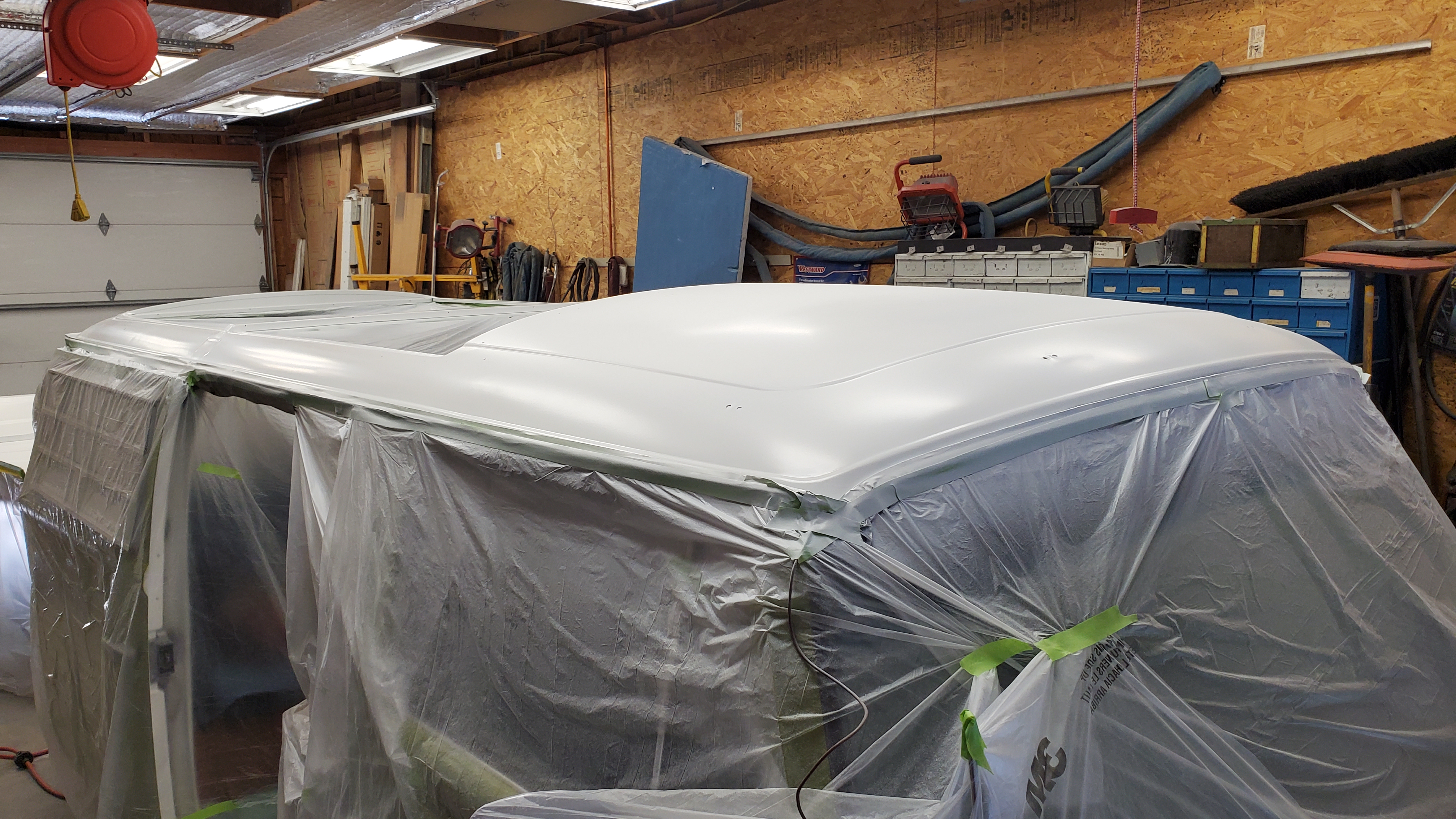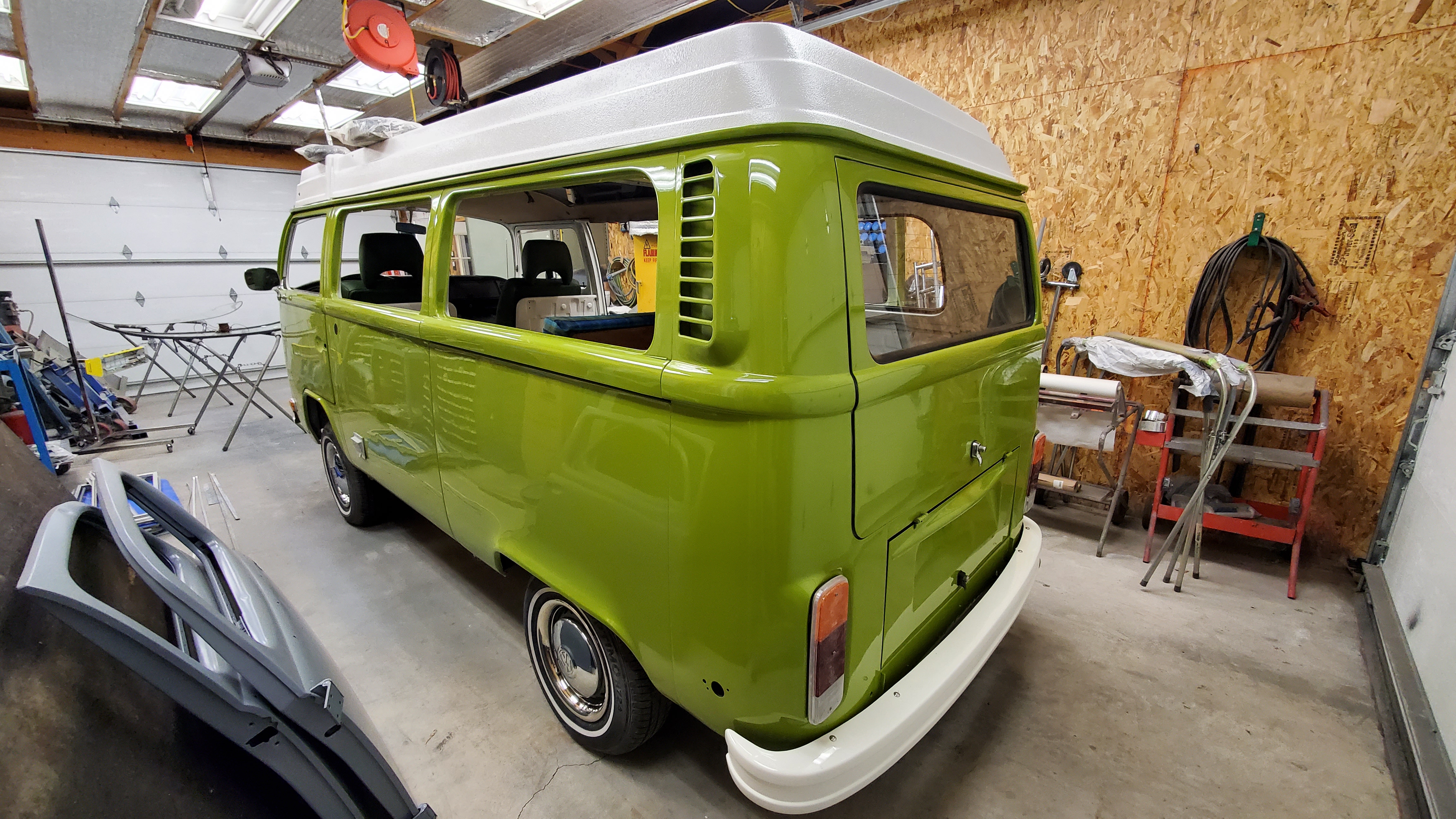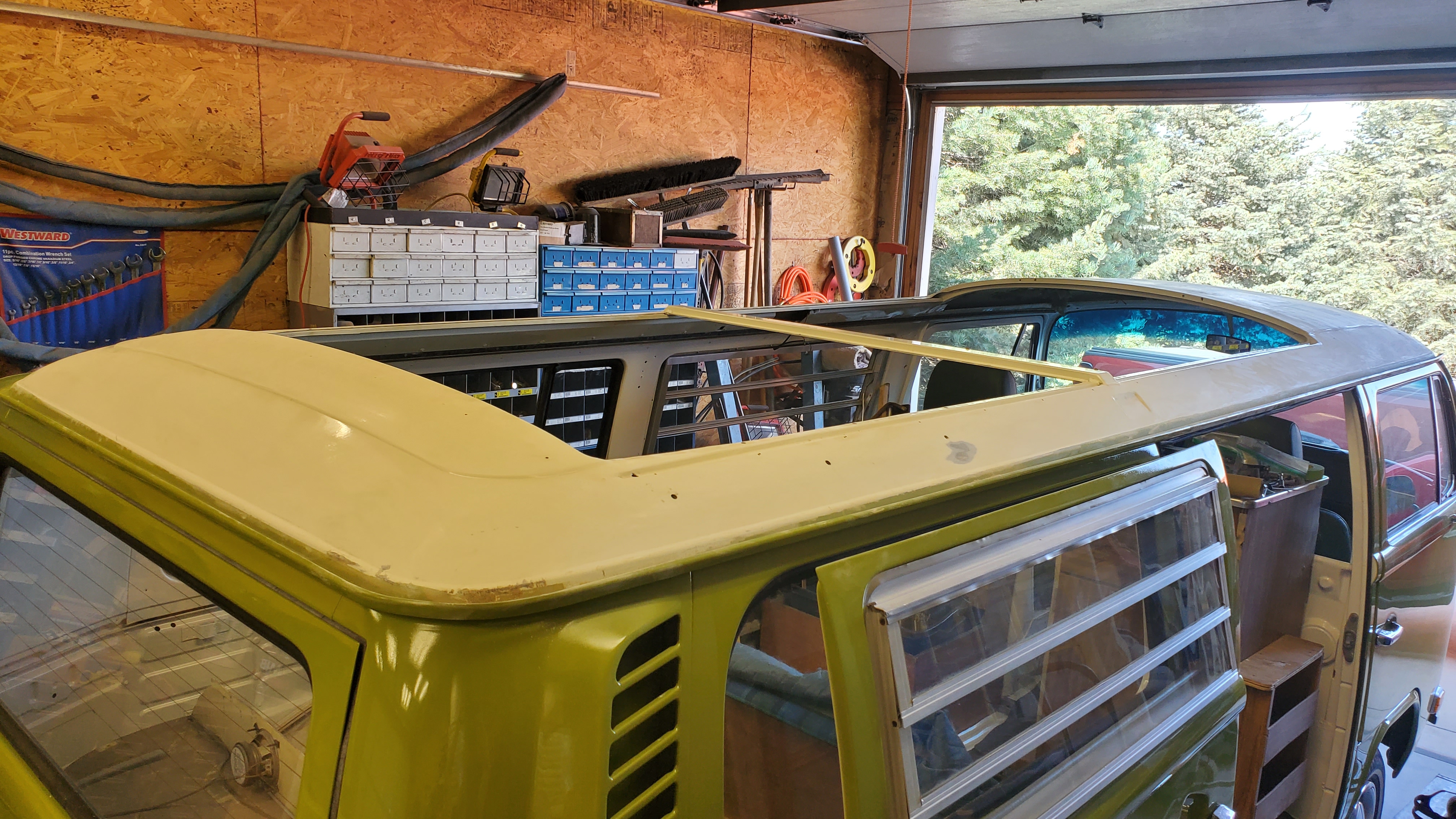 The top was removed to paint the exterior, but they skipped the roof and inside the pop-top.