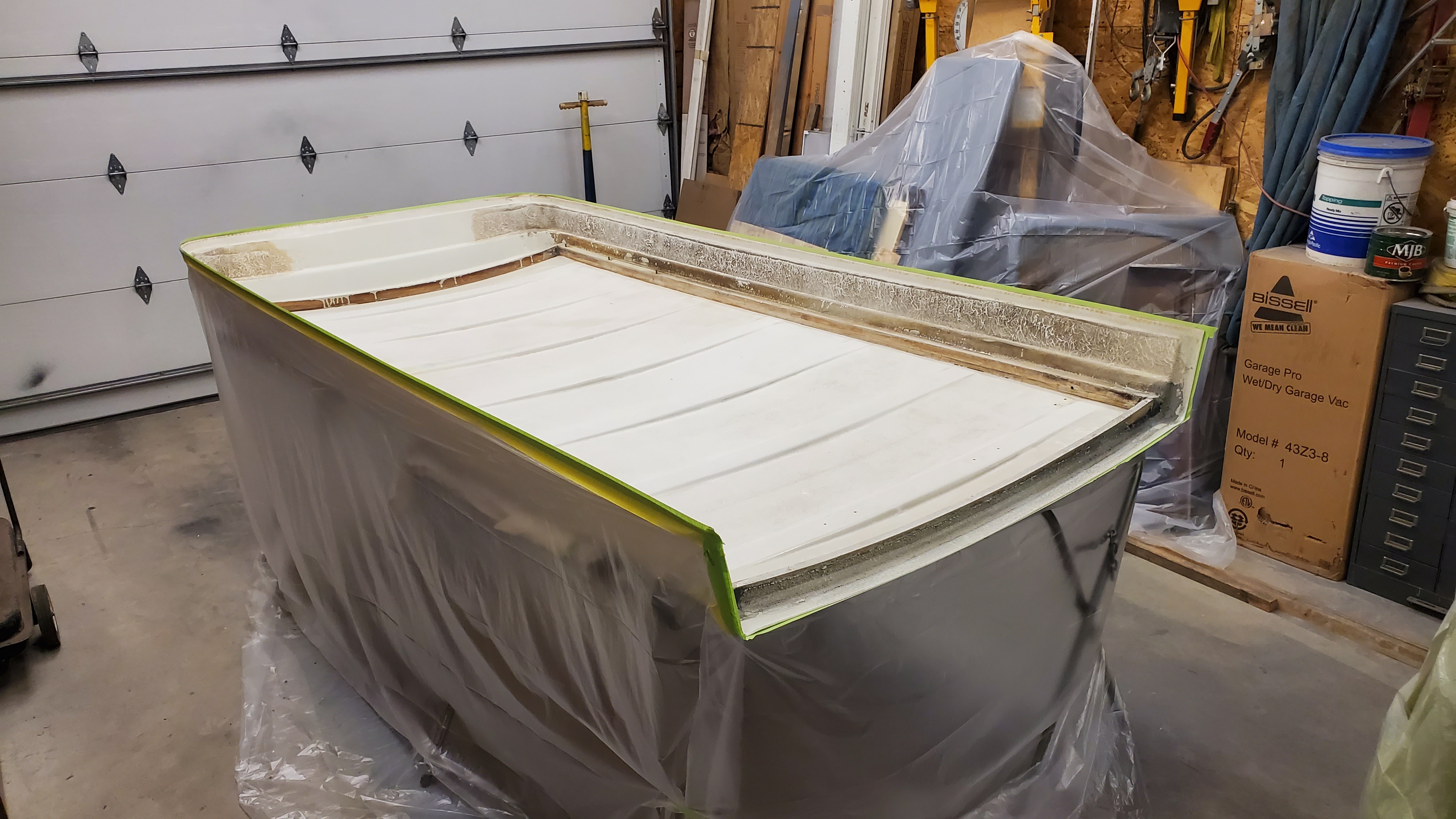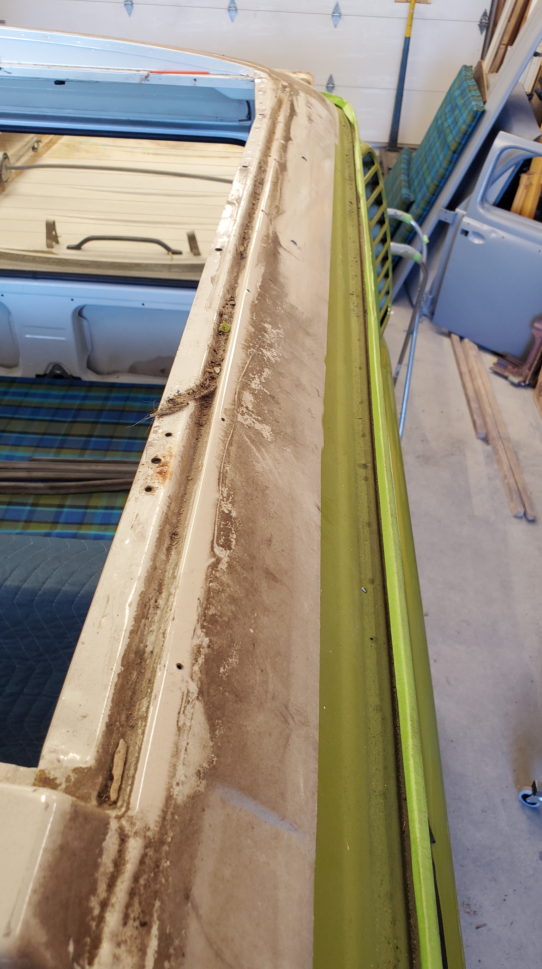 The tricky part was to leave a space where I could climb in the center to get the bottom of the front bed support rail. The interior was painted bright white previously, and it was masked off around the top, as was the support rail. It was the original silver-beige, and the only thing that color left.