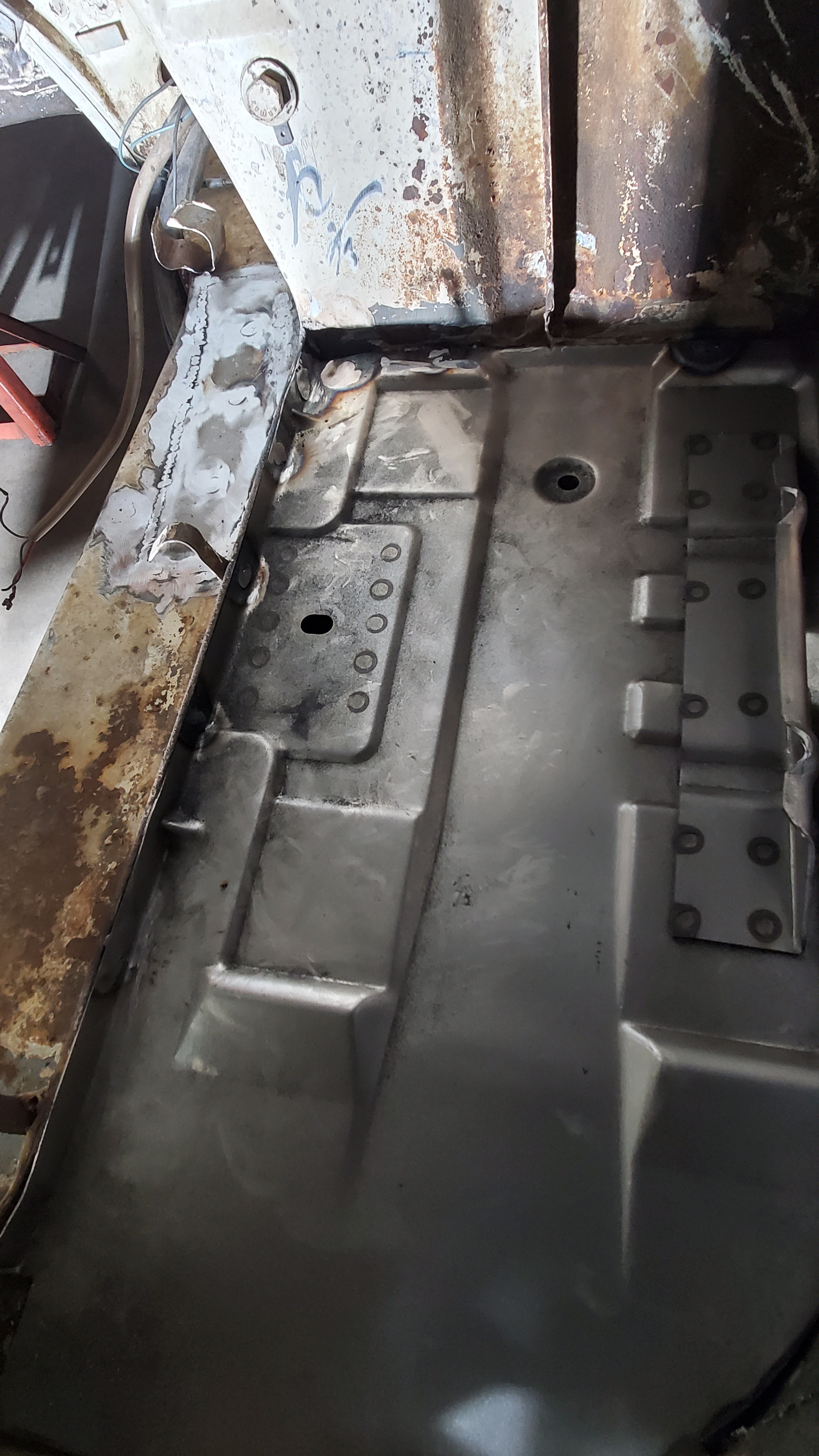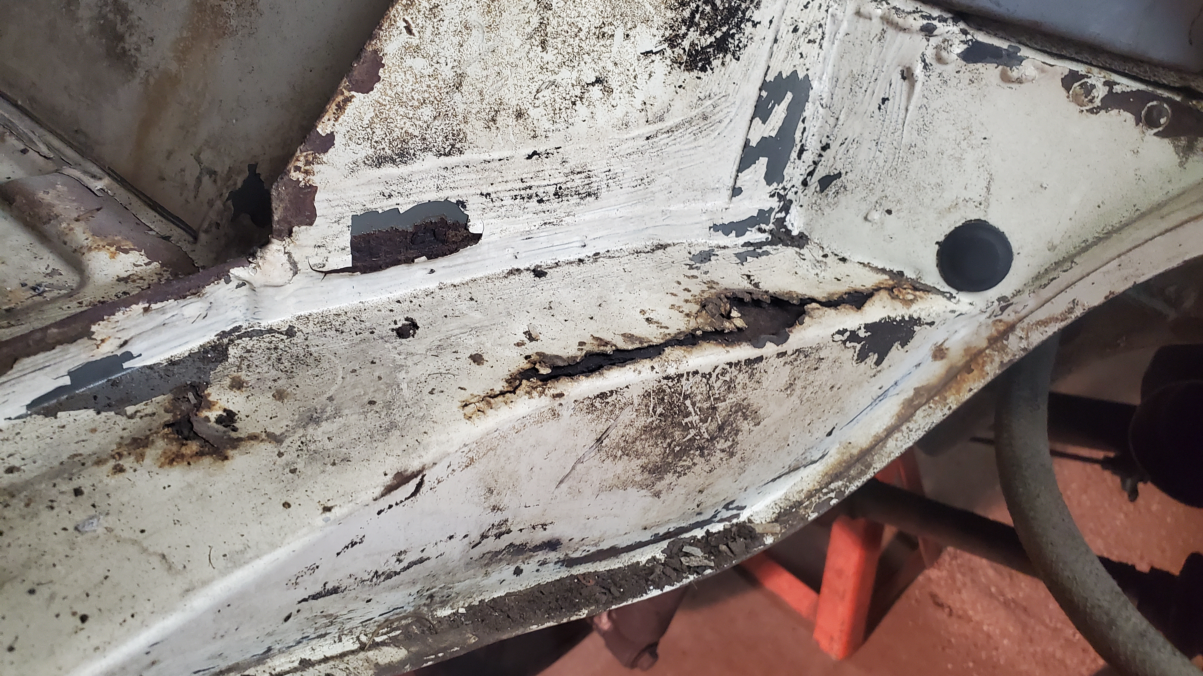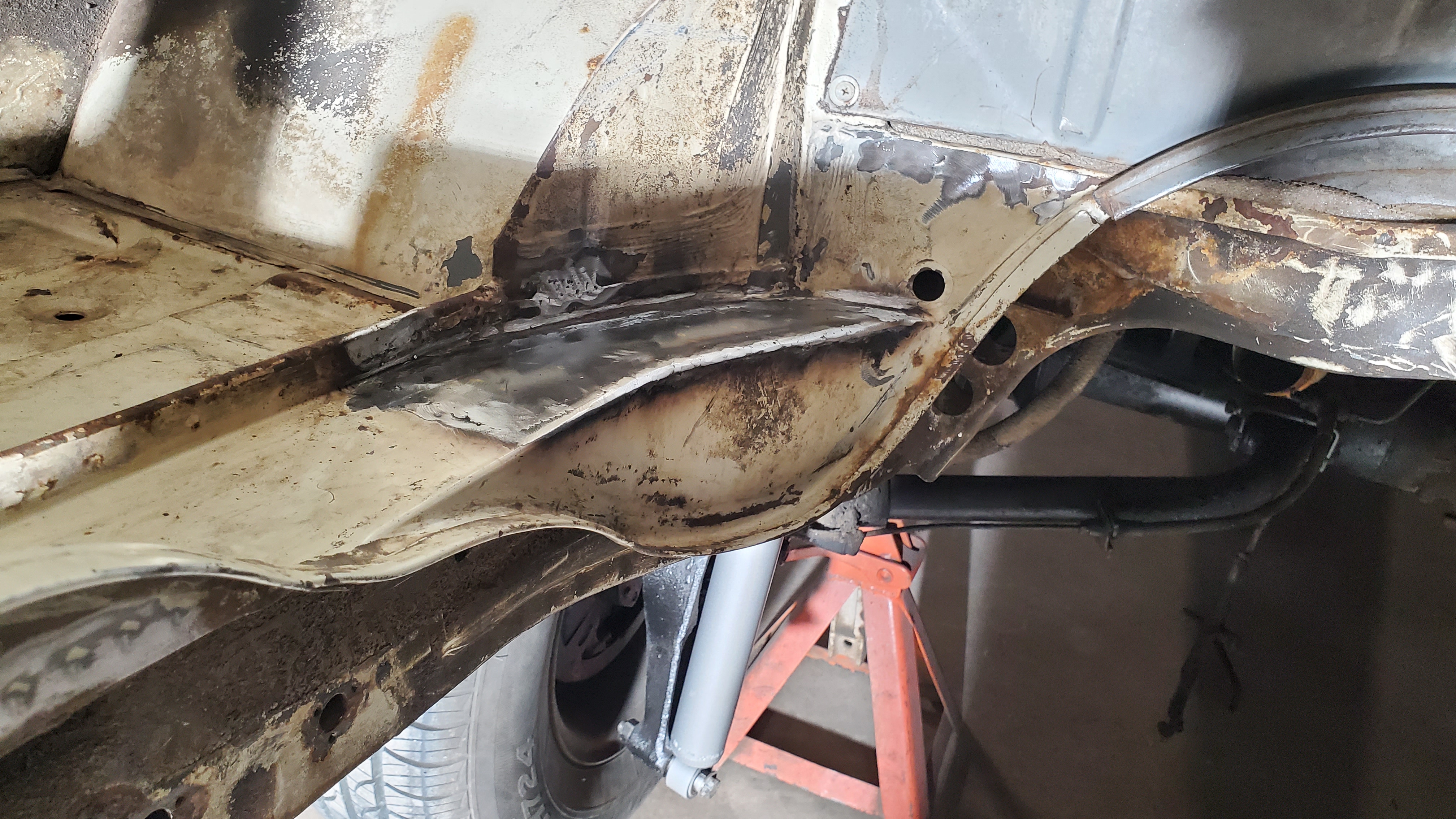 The rails had rust on the top where the panels overlapped. Once the rust is cut out, the metal is cleaned and painted, including the interior of the patches. After the welding is complete, the bottom seams will be sealed with seam sealer, following thorough preparation and cleaning of all surfaces for painting.
