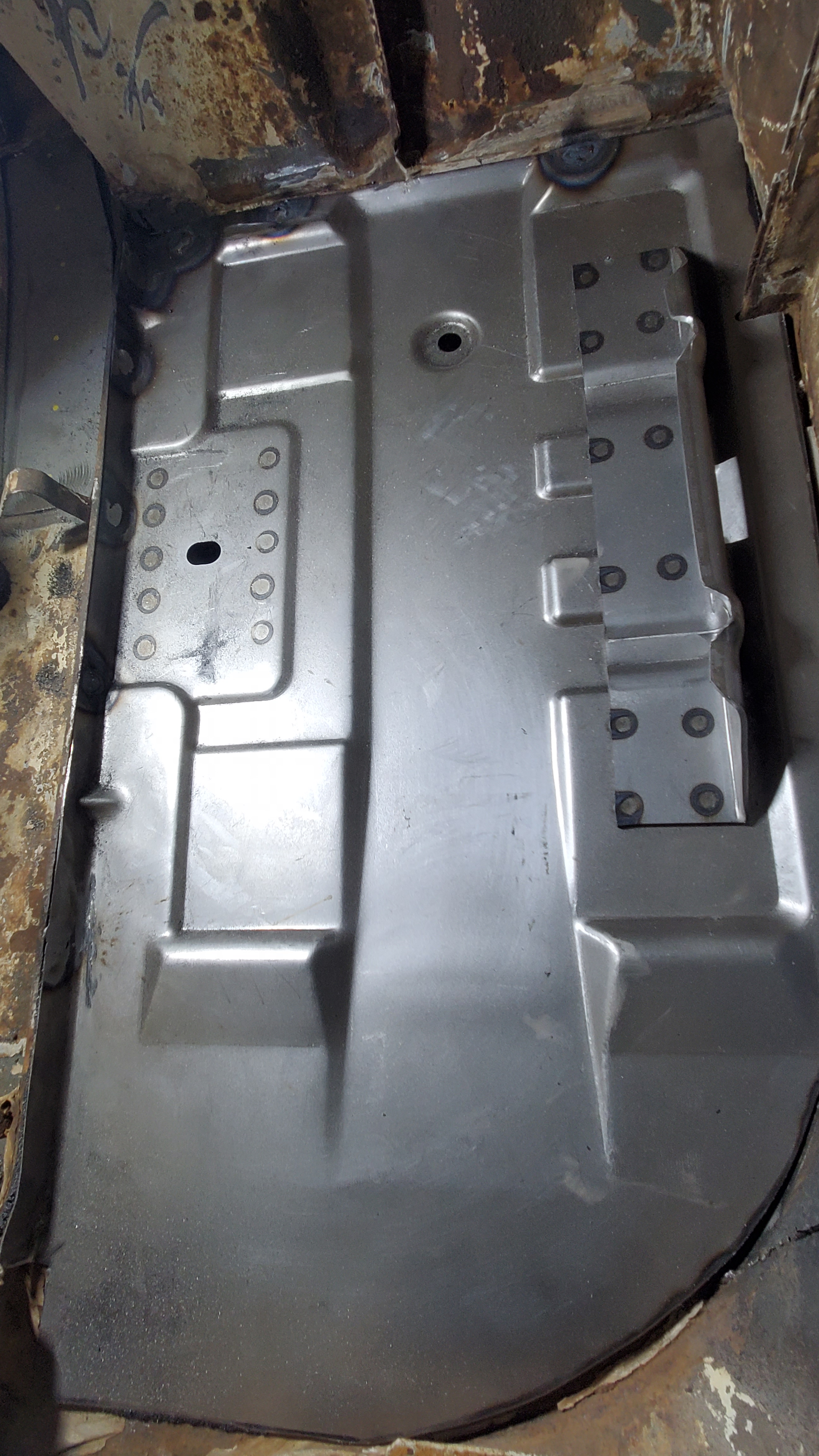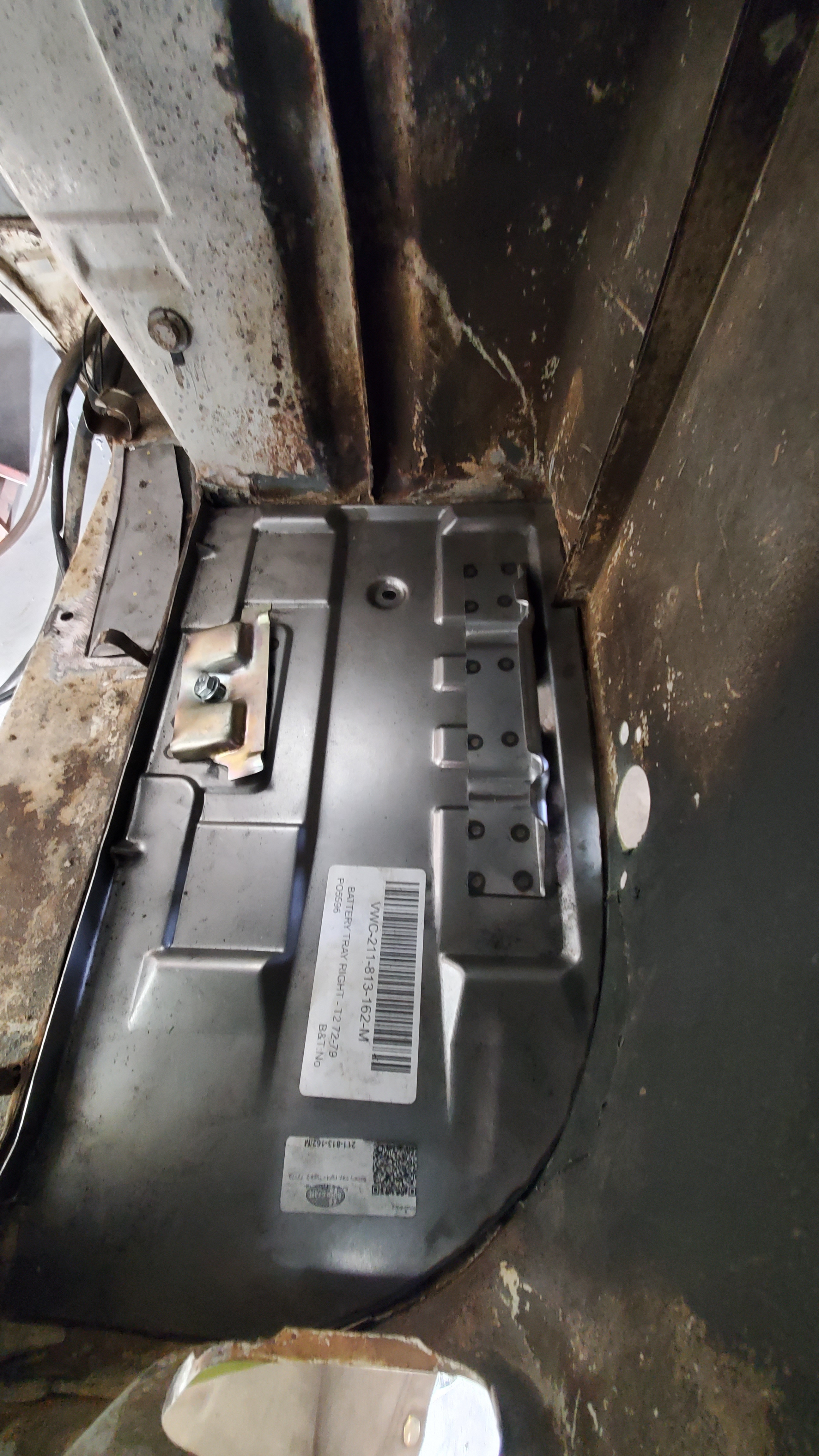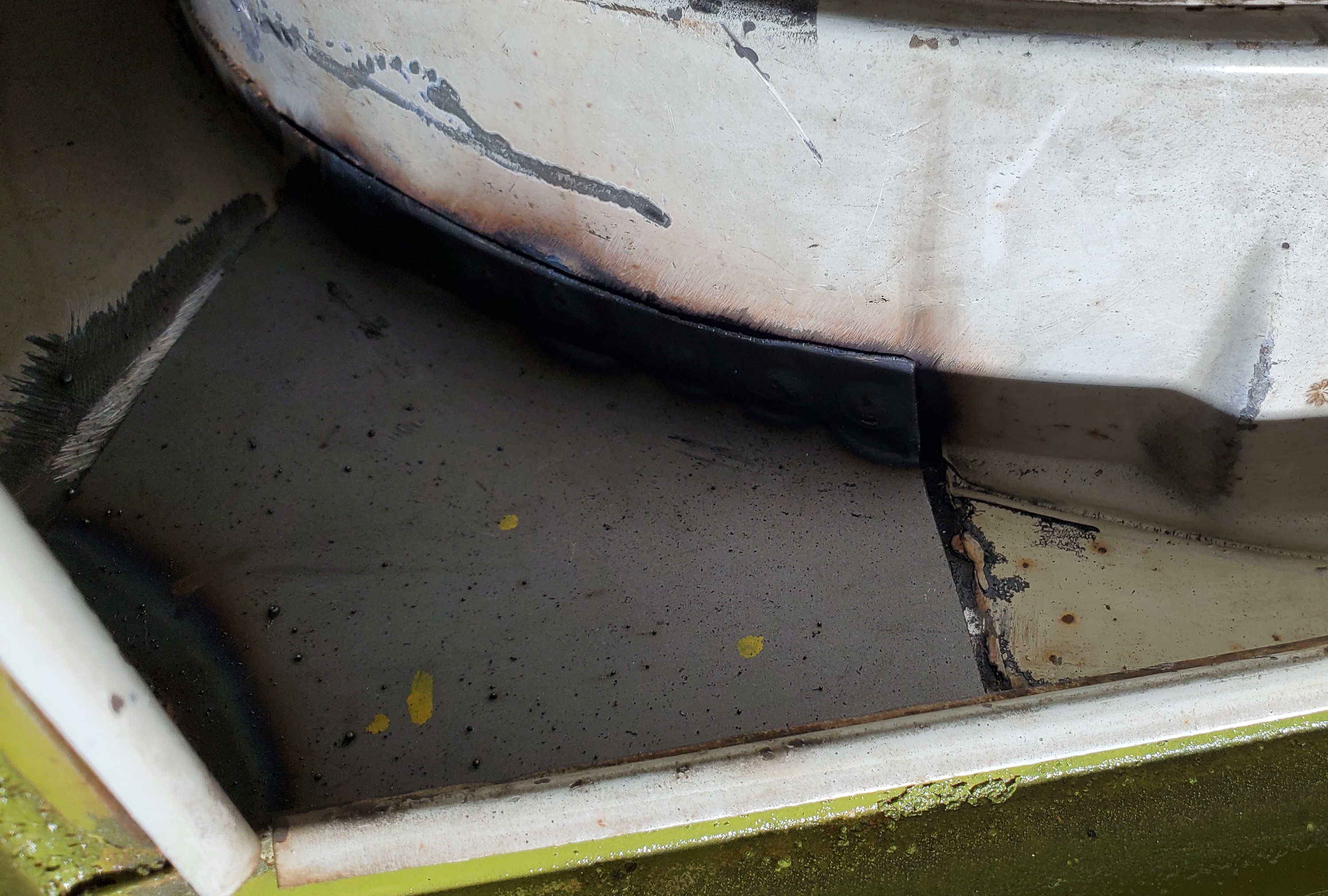 The battery tray is a bit tricky to install after the bus has been painted. The exterior lip was carefully trimmed to fit snugly into place, sitting on top of a lip from the old tray. All remnants of the old tray were removed from the other sides, and the new tray was welded around two-thirds of the perimeter. Once ready for paint, all the seams will be sealed with seam sealer.